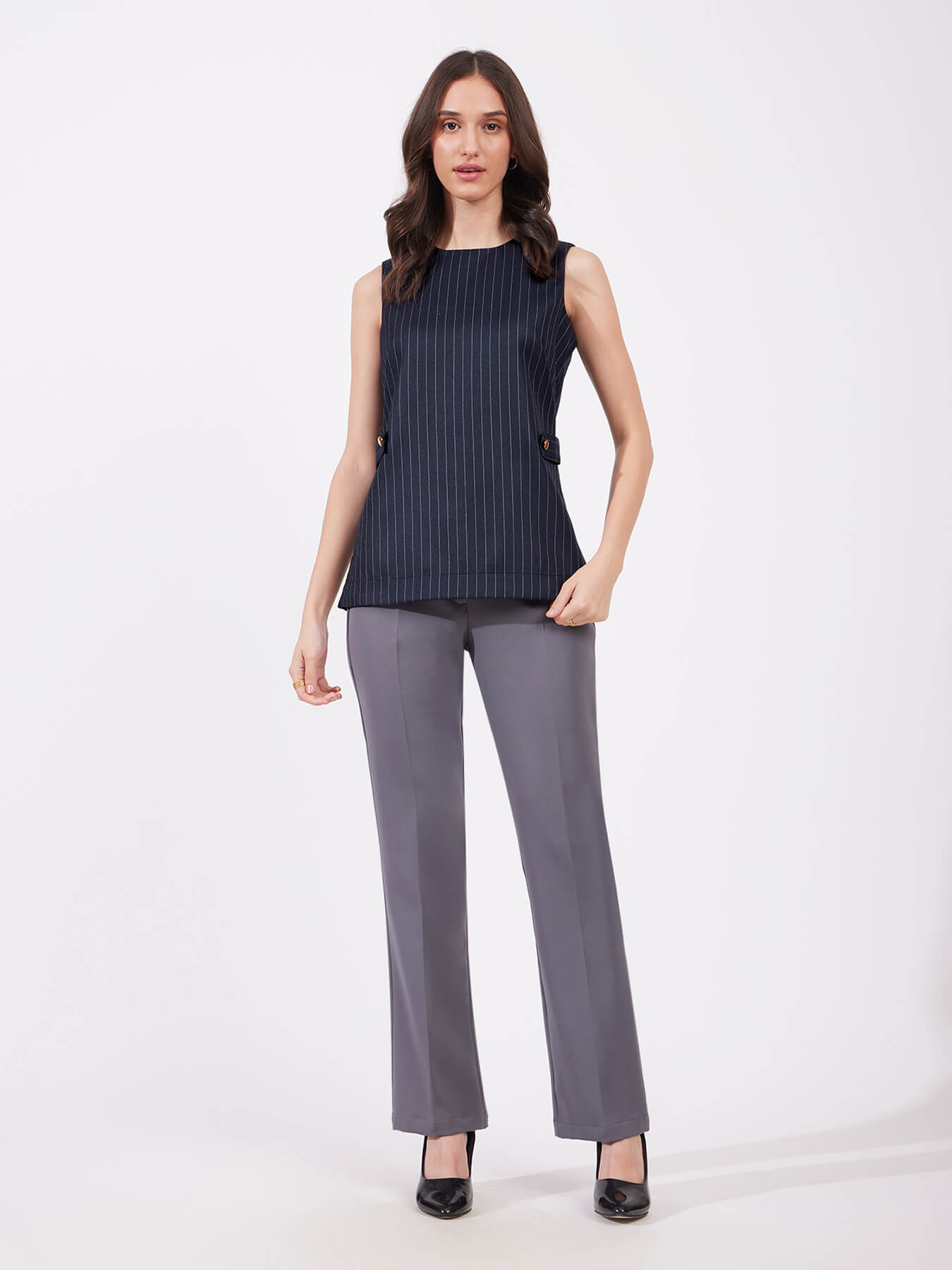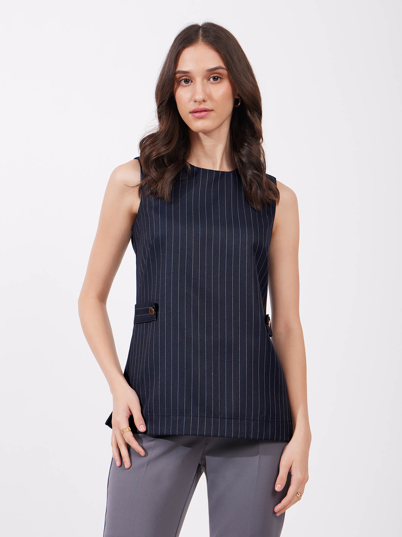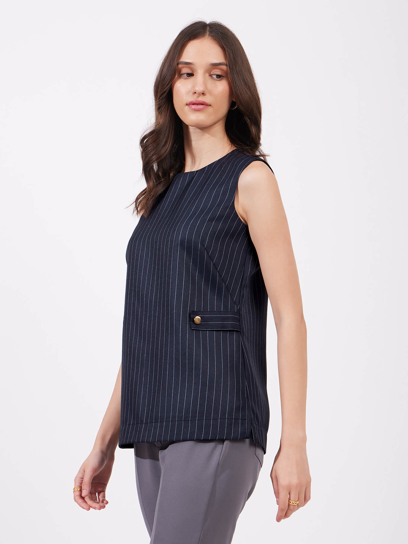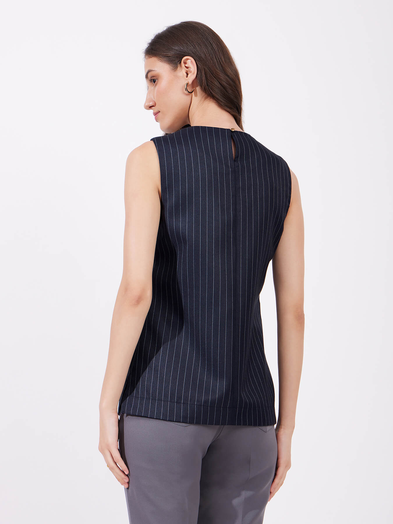 Pinstripe Round Neck Top - Navy Blue