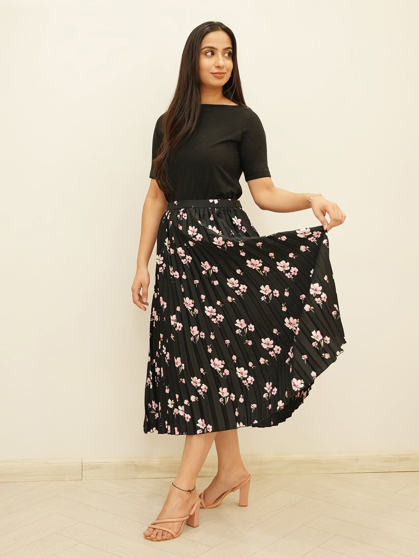 This black, flared, mid-rise, midi formal skirt has floral print, accordion pleats, elasticated belt with hook & concealed zip for closure and attached Polyester lining. Made from fine Polyester Crepe, it's immensely soft and anti-wrinkle with a flawless drape.