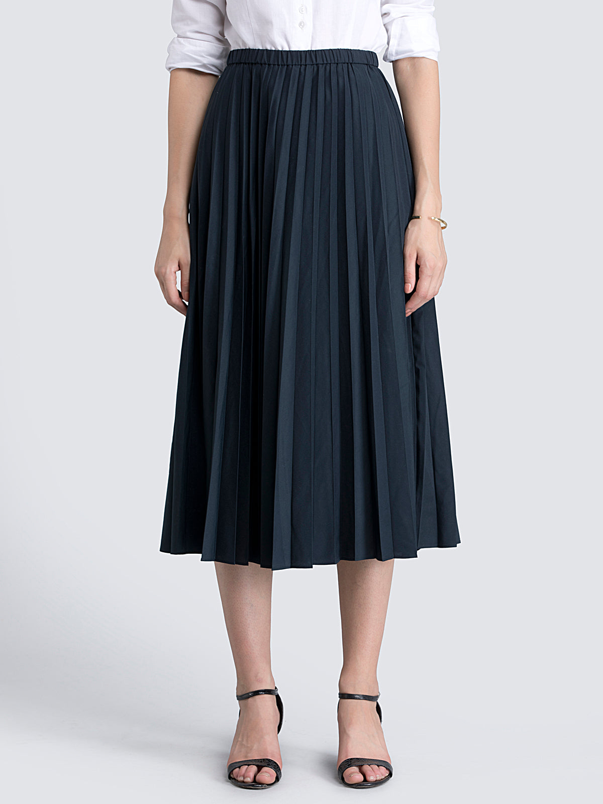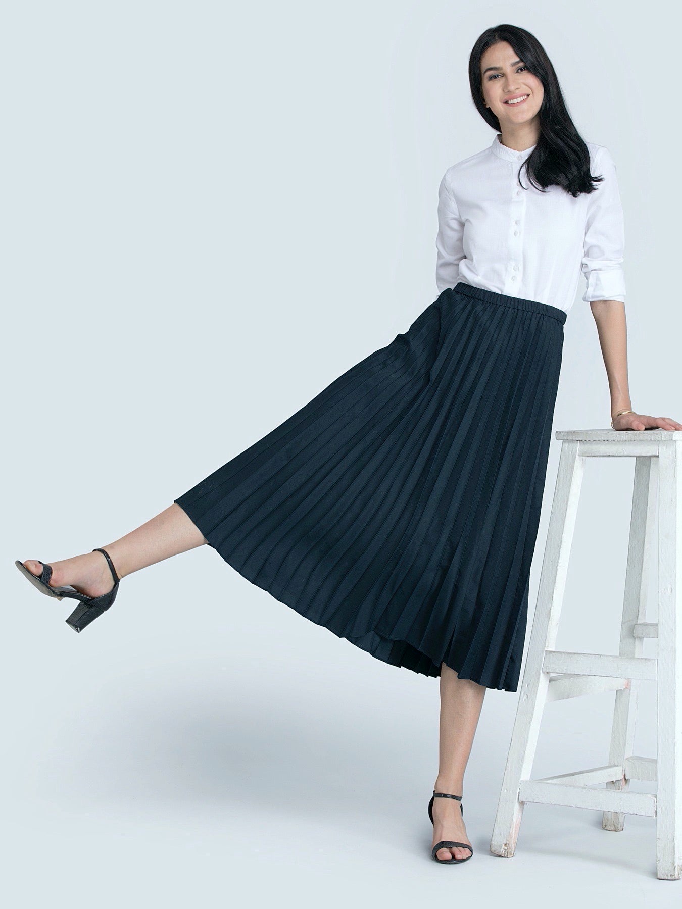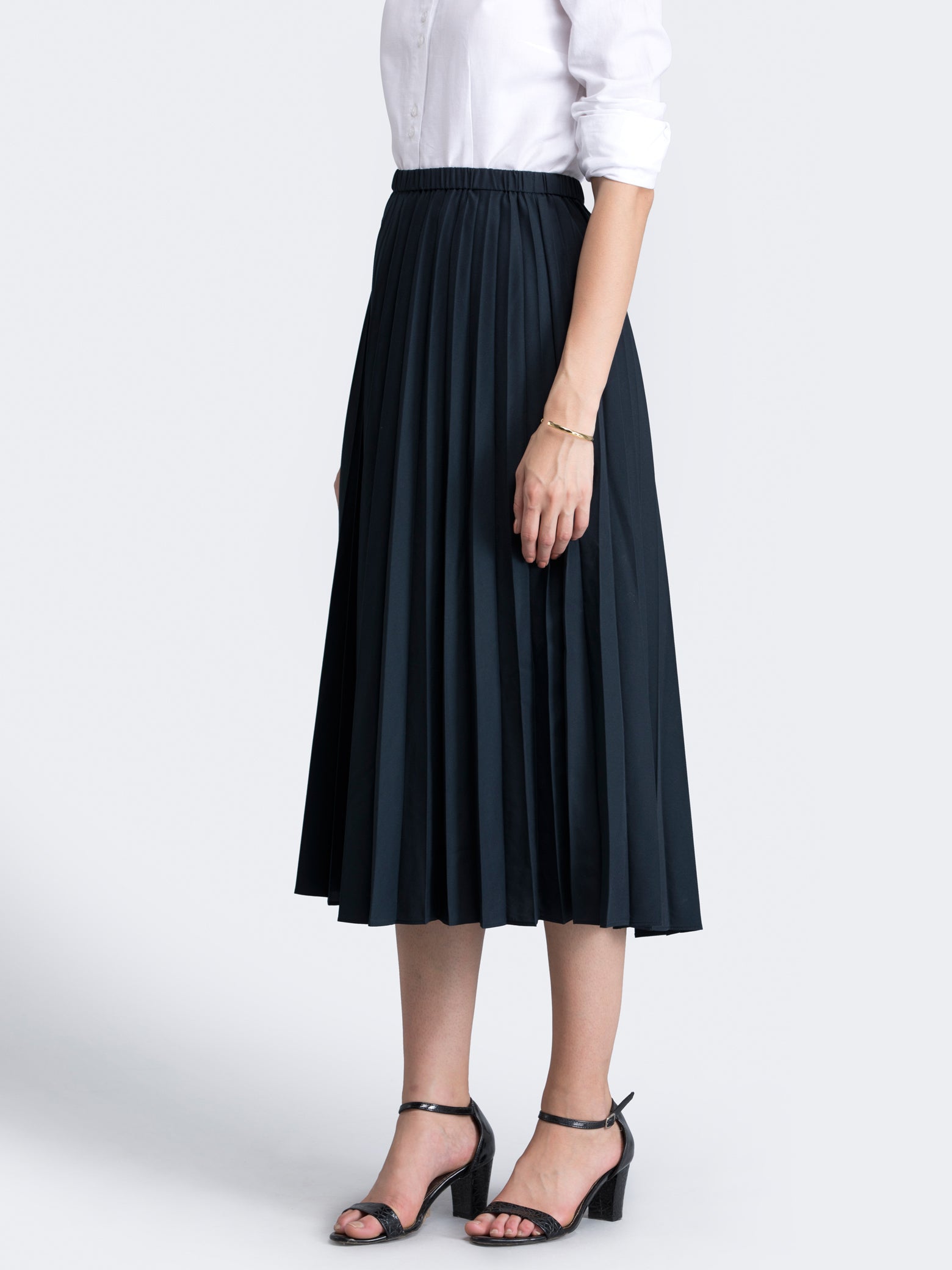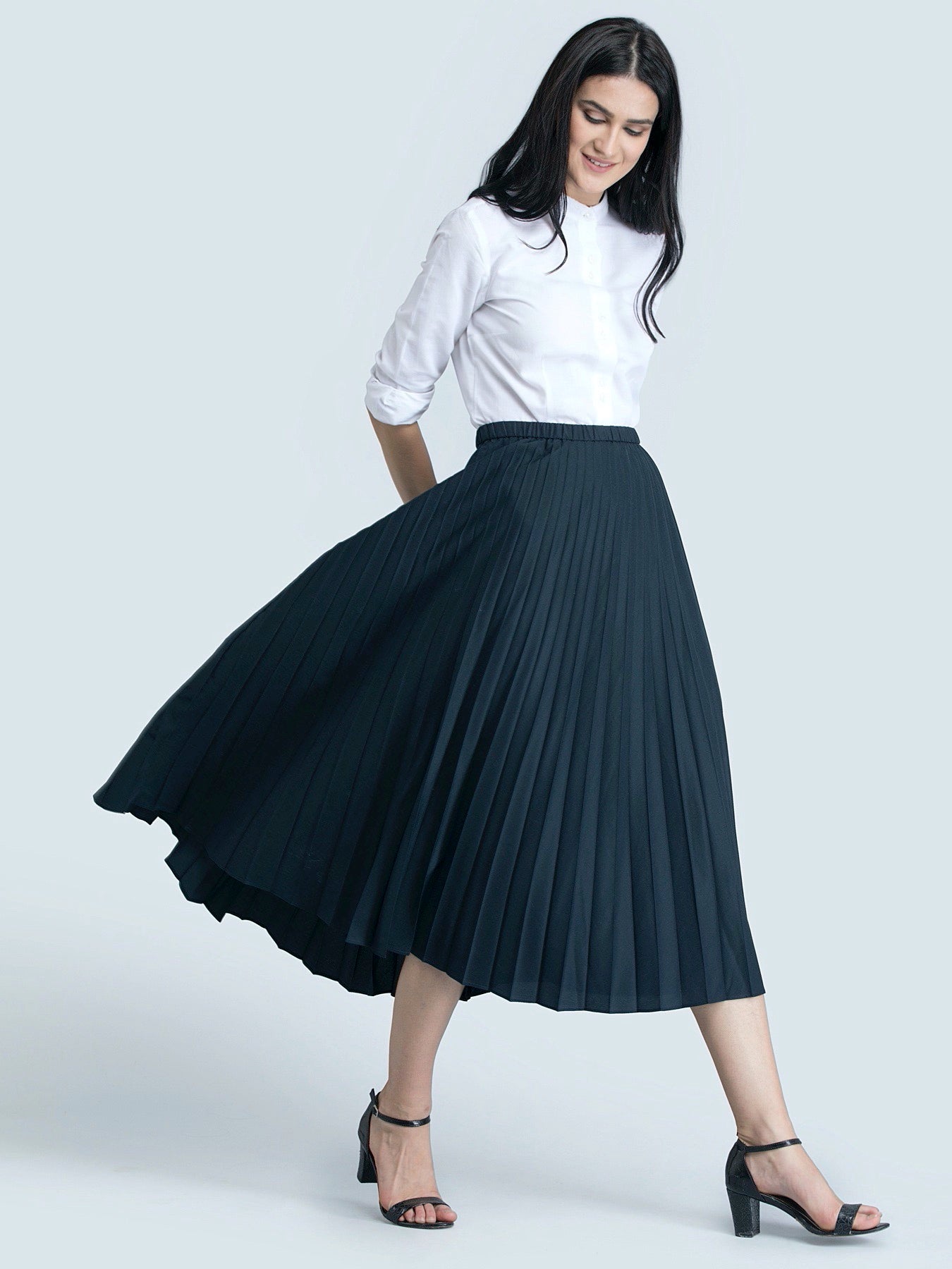This black, flared, midi skirt has pleats, side zip for closure and attached Polyester lining. Made from fine Poly Crepe, it's immensely soft with a flawless drape.
