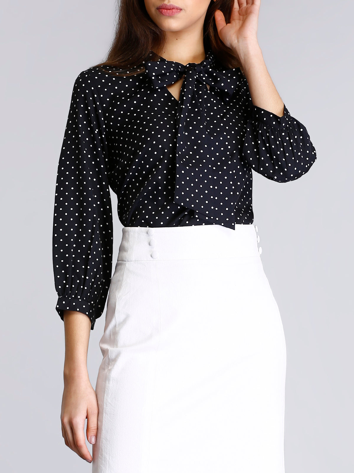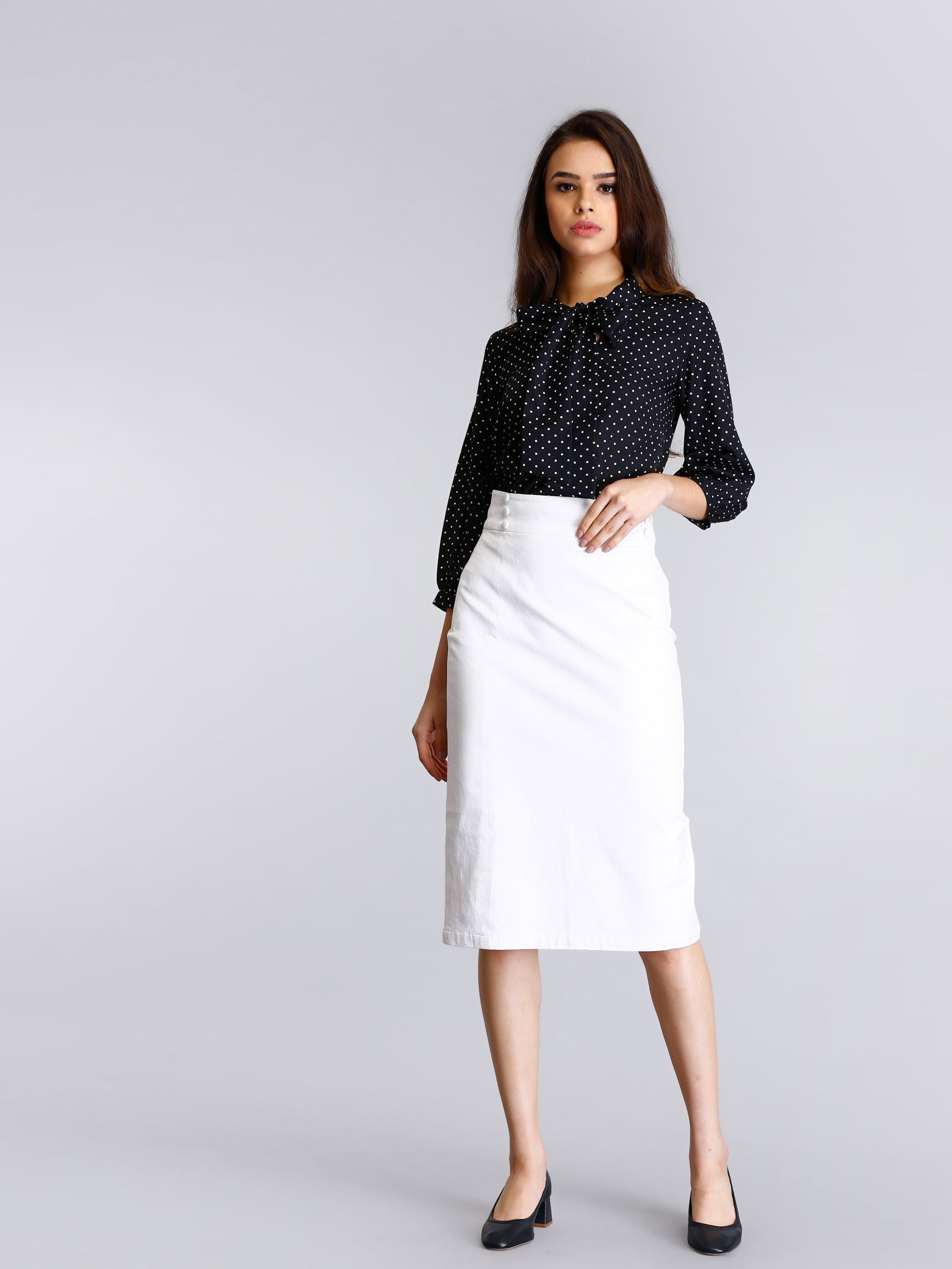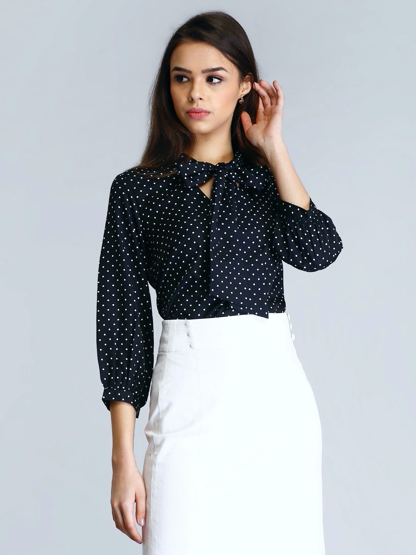 Make a strong first impression with this lovely monochrome top. It has a pussy bow neckline, ¾ sleeves with delicate gathers and slits for easy movement. Made from fine Poly Crepe, it's immensely soft and anti-wrinkle with a flawless drape.