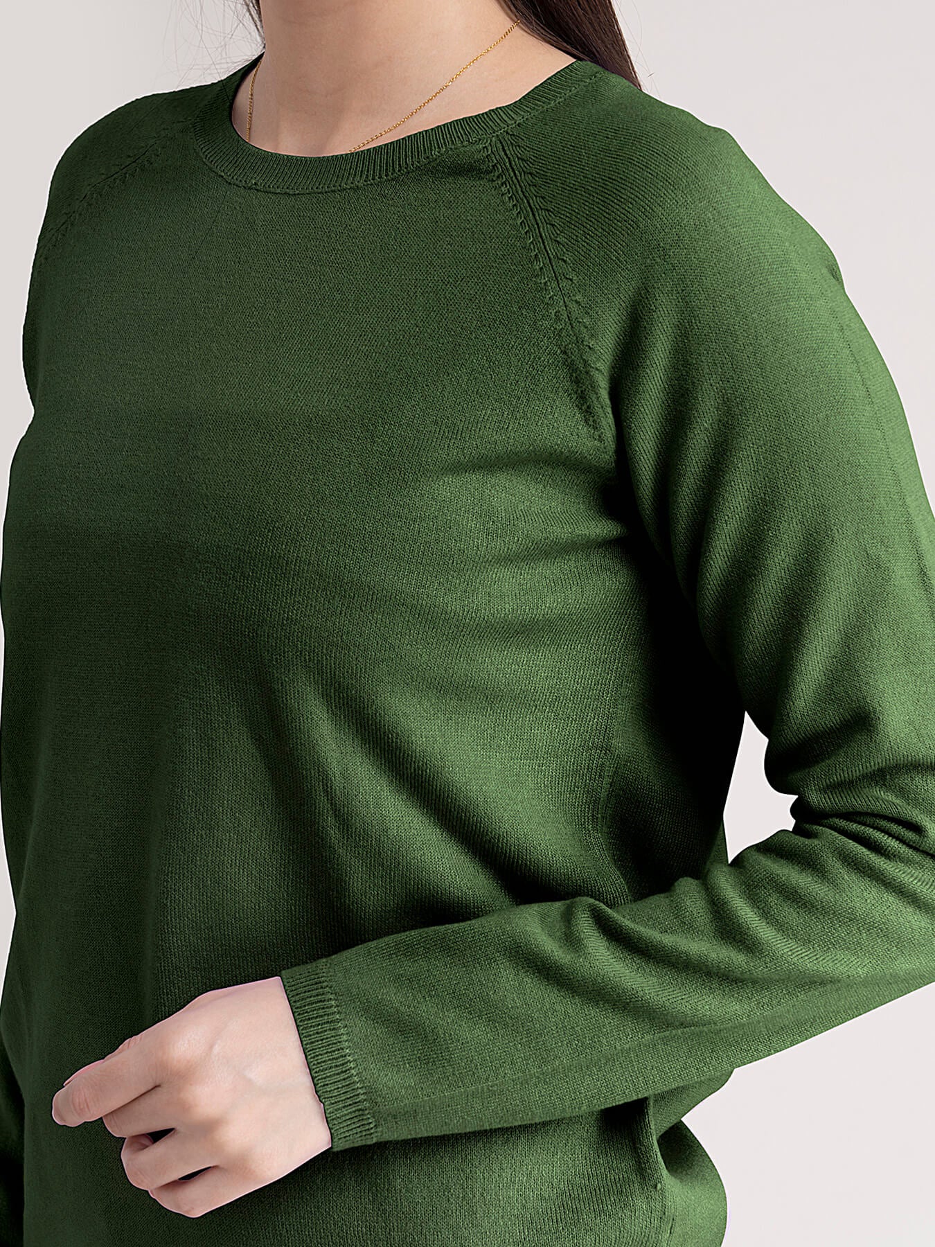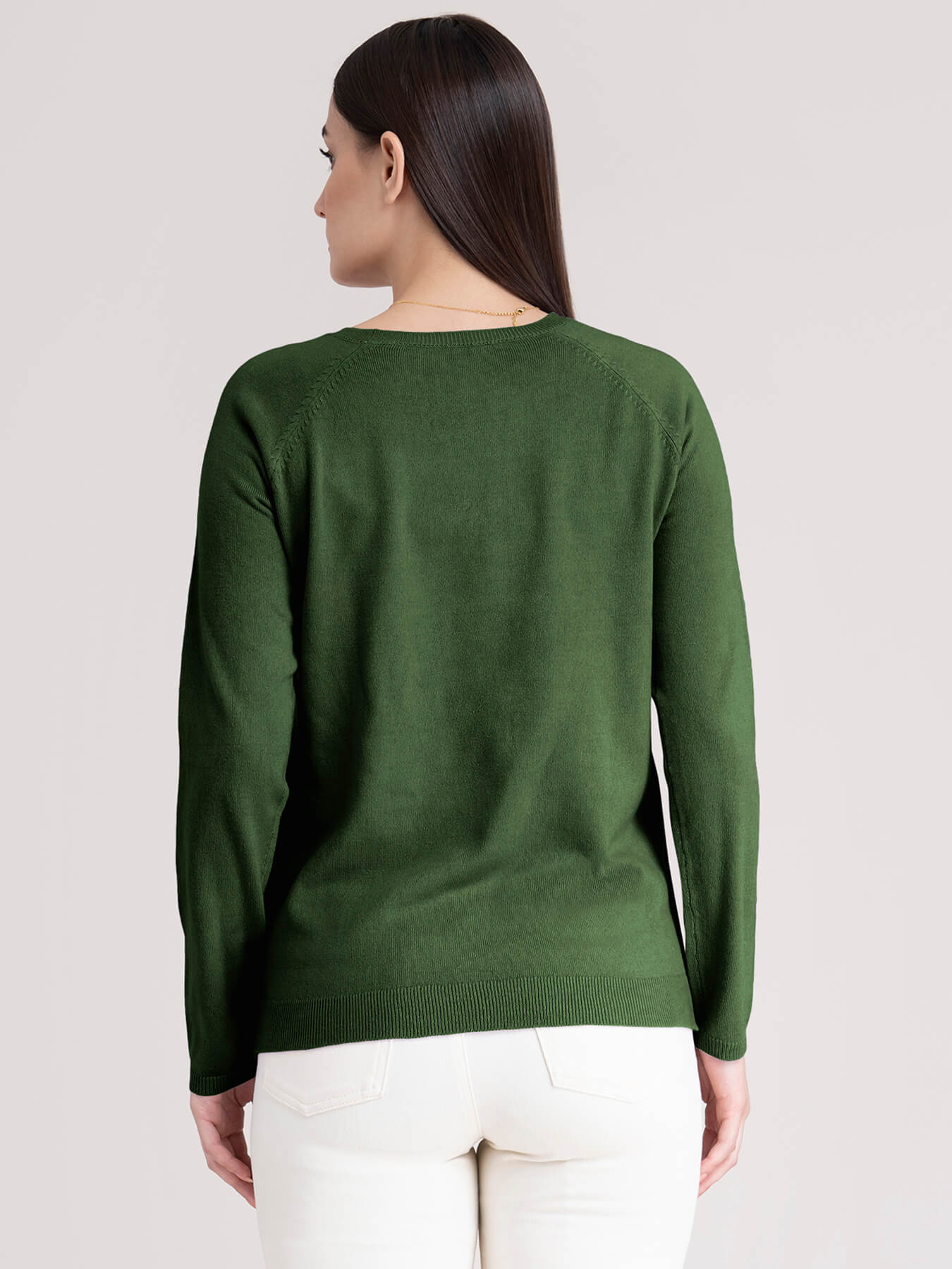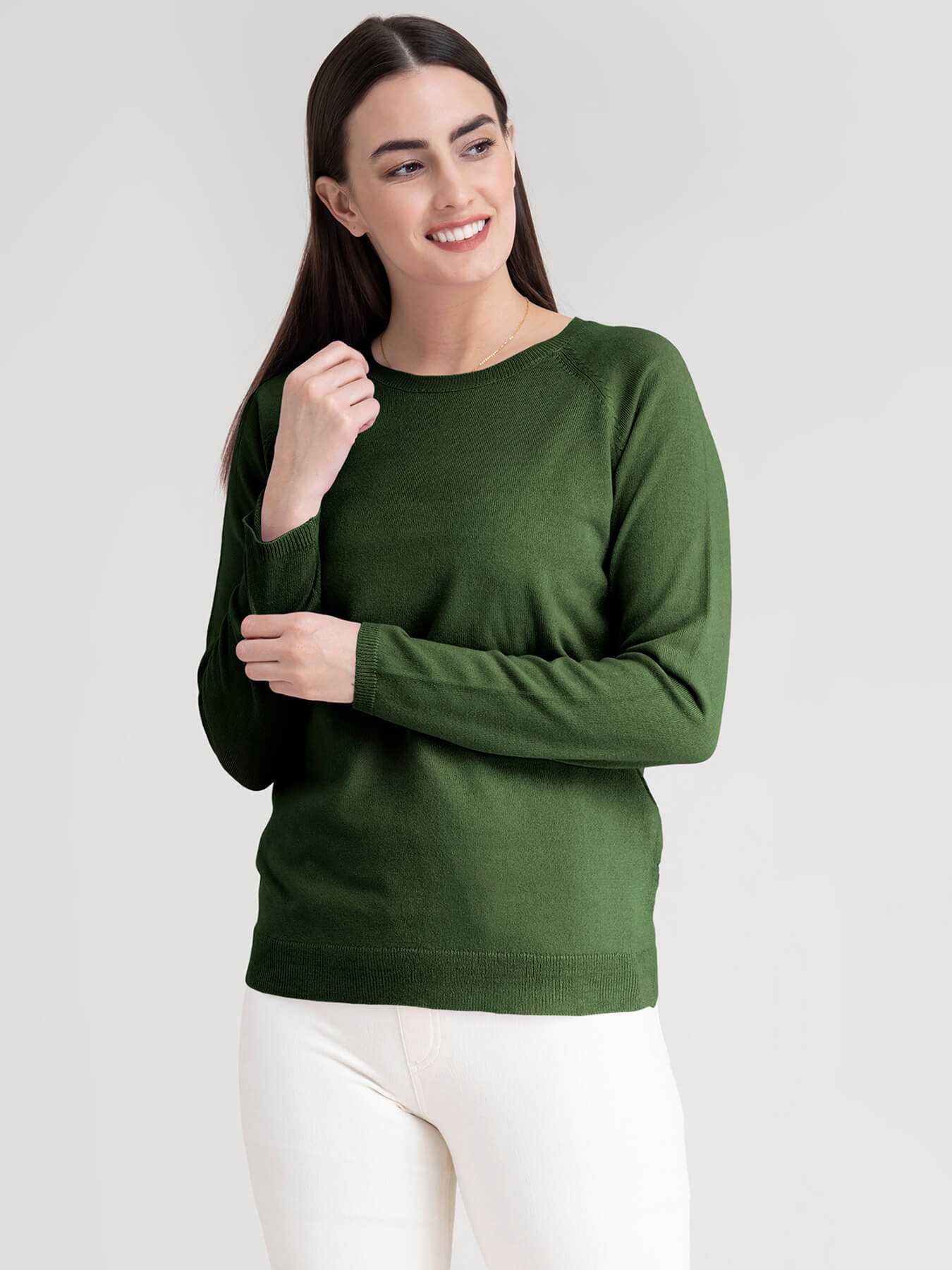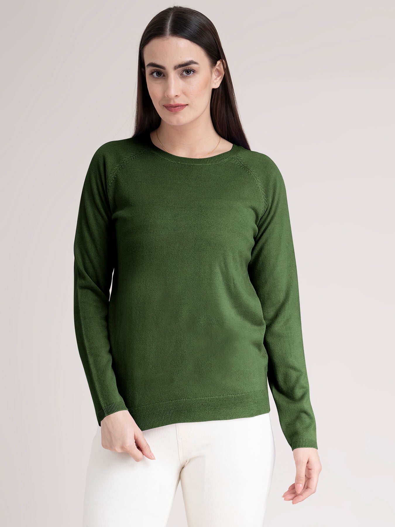 This olive sweater has a round neck and ranglan sleeves. Made from Acrylic, it is ultra-soft, breathable, comfortable and stretchable. The hem of the sweater is intended to fall according to the image on a height of 5'3" to 5'5". Colour may vary slightly according to screen settings and resolution.