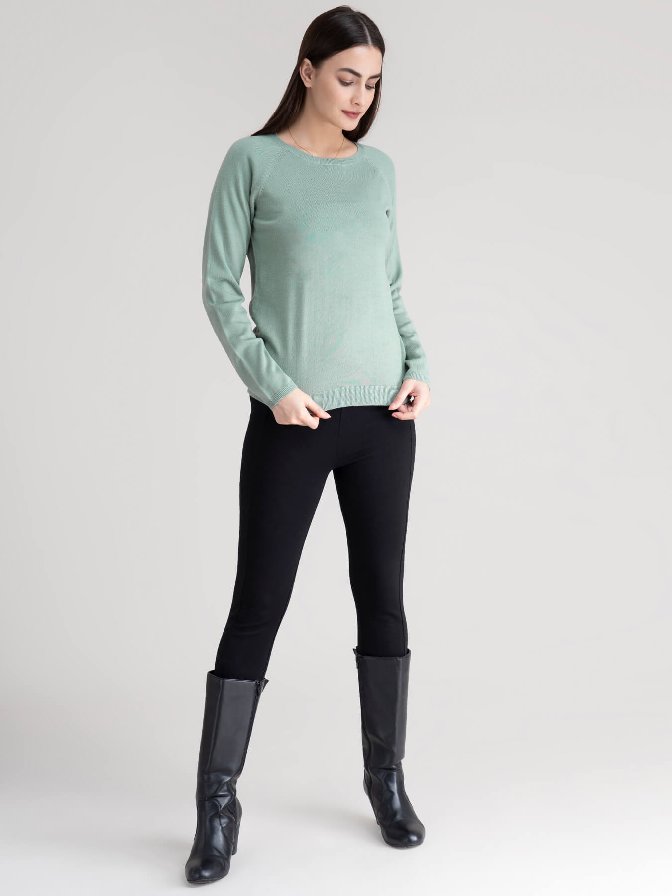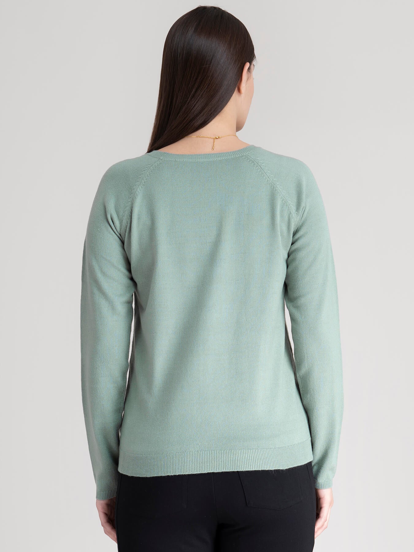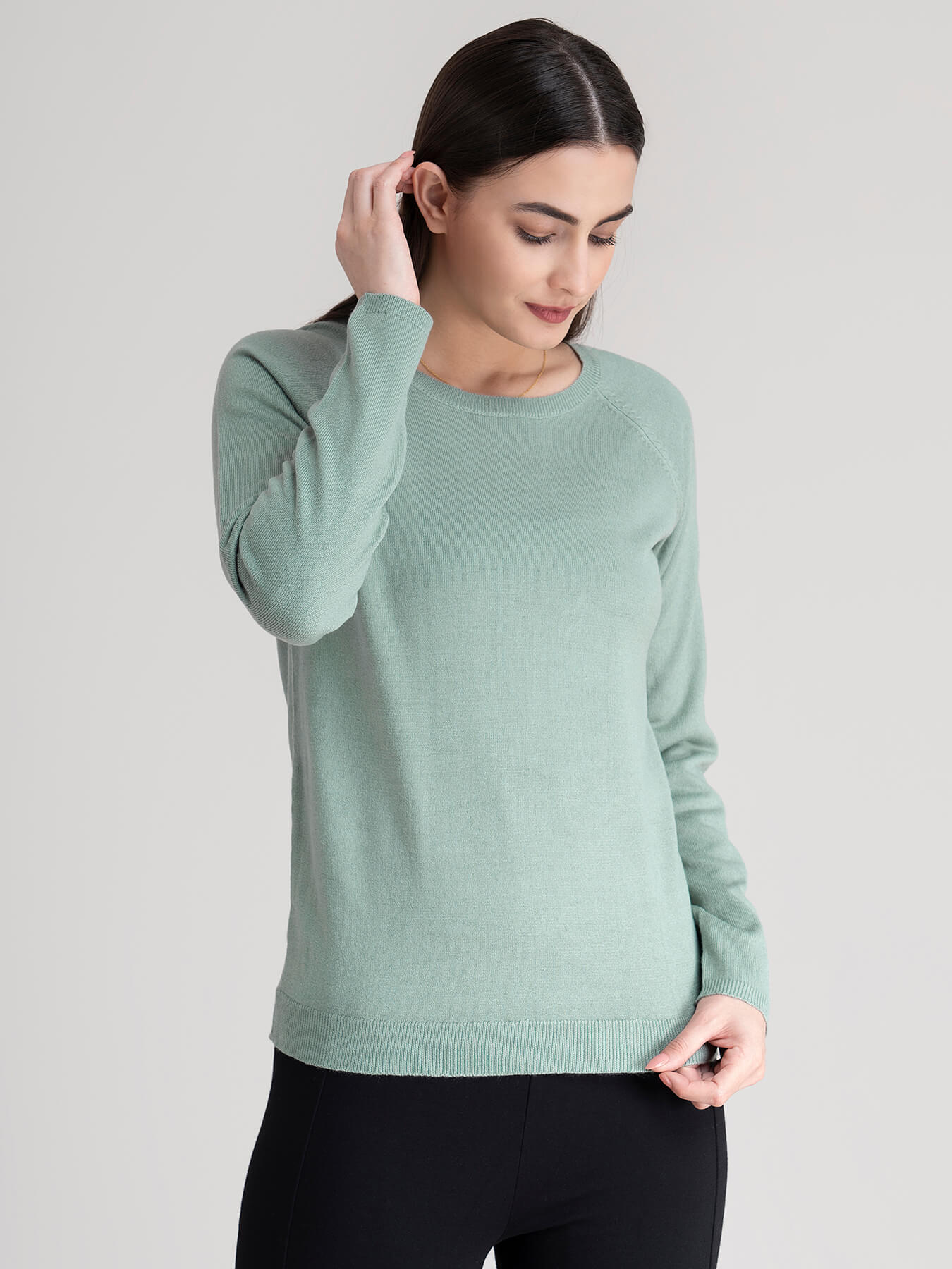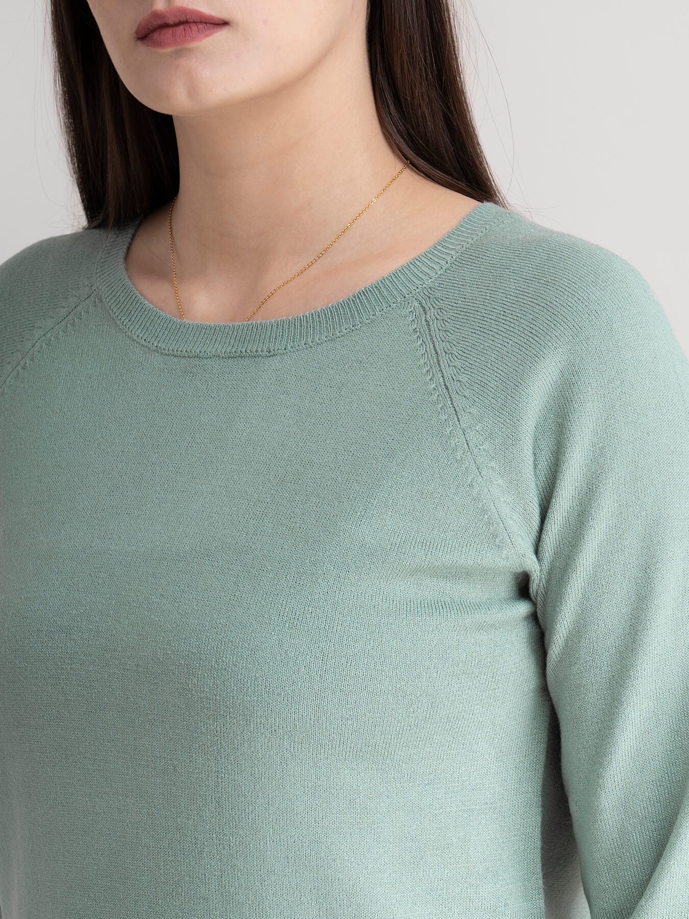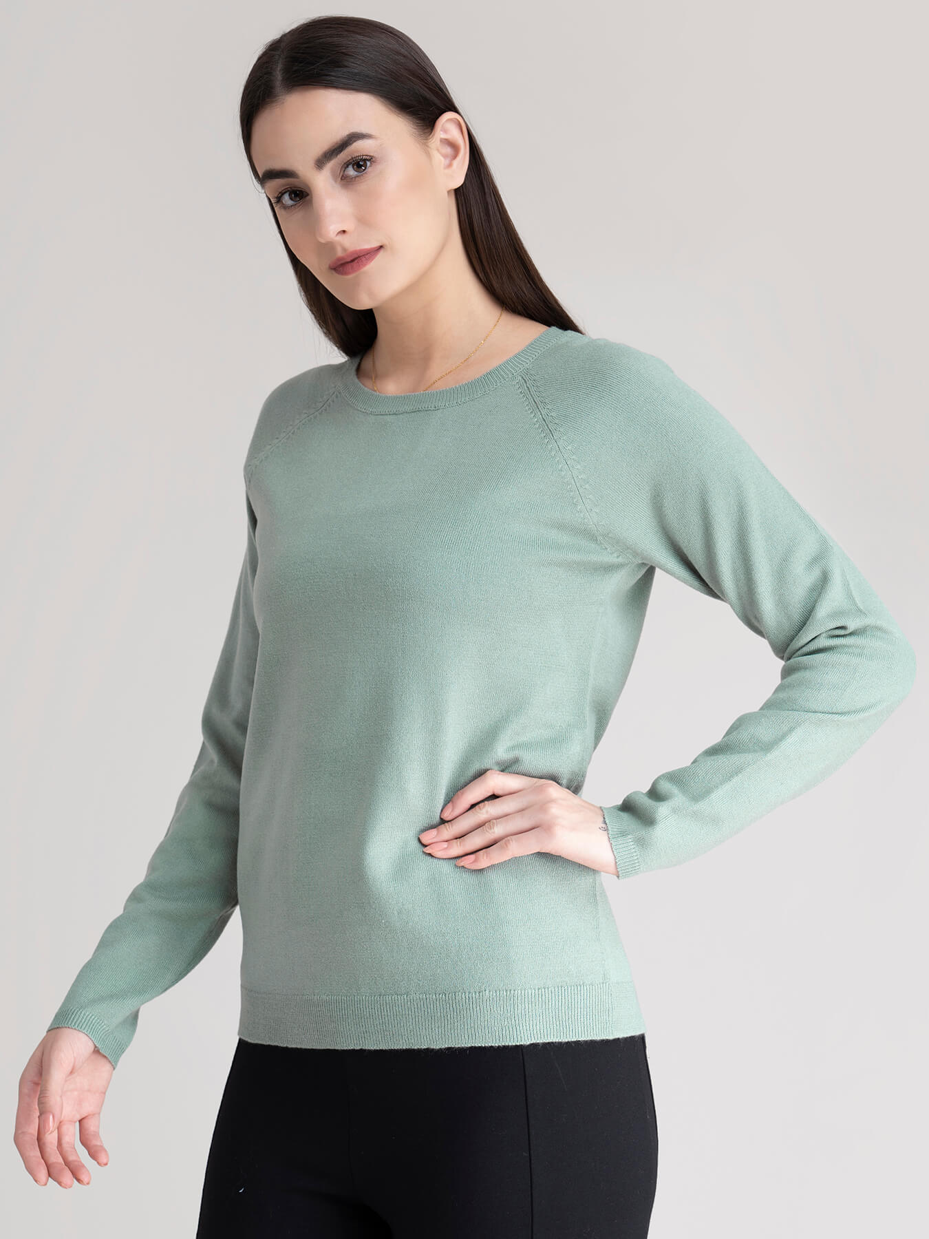 This sap green sweater has a round neck and ranglan sleeves. Made from Acrylic, it is ultra-soft, breathable, comfortable and stretchable. The hem of the sweater is intended to fall according to the image on a height of 5'3" to 5'5". Colour may vary slightly according to screen settings and resolution.