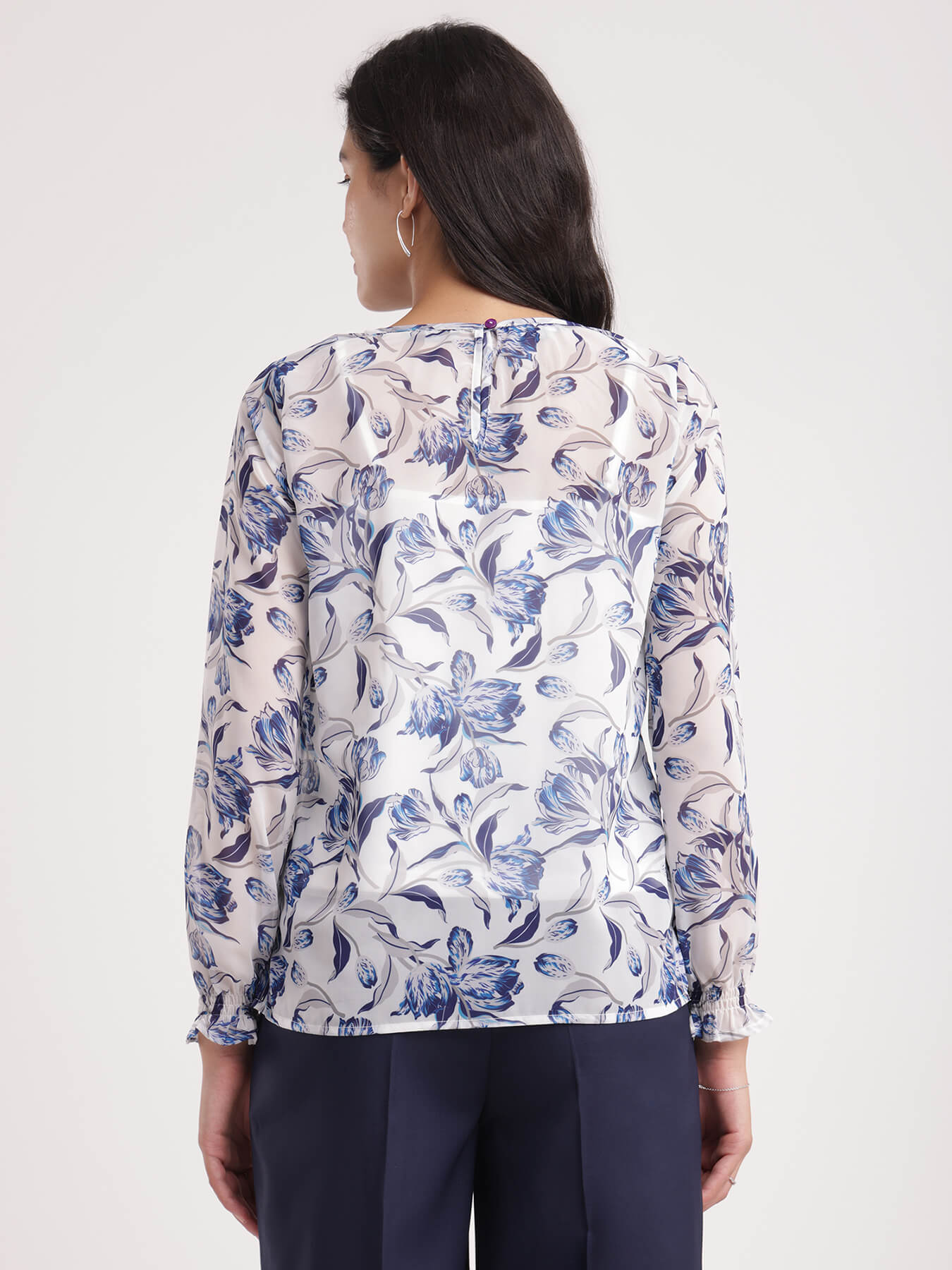 This sheer white top has a round neck, floral pattern, full sleeves with ruching details at the cuff, keyhole back for closure and knitted Polyester camisole with adjustable straps. Created from Georgette, it is soft, luxurious and anti-wrinkle.