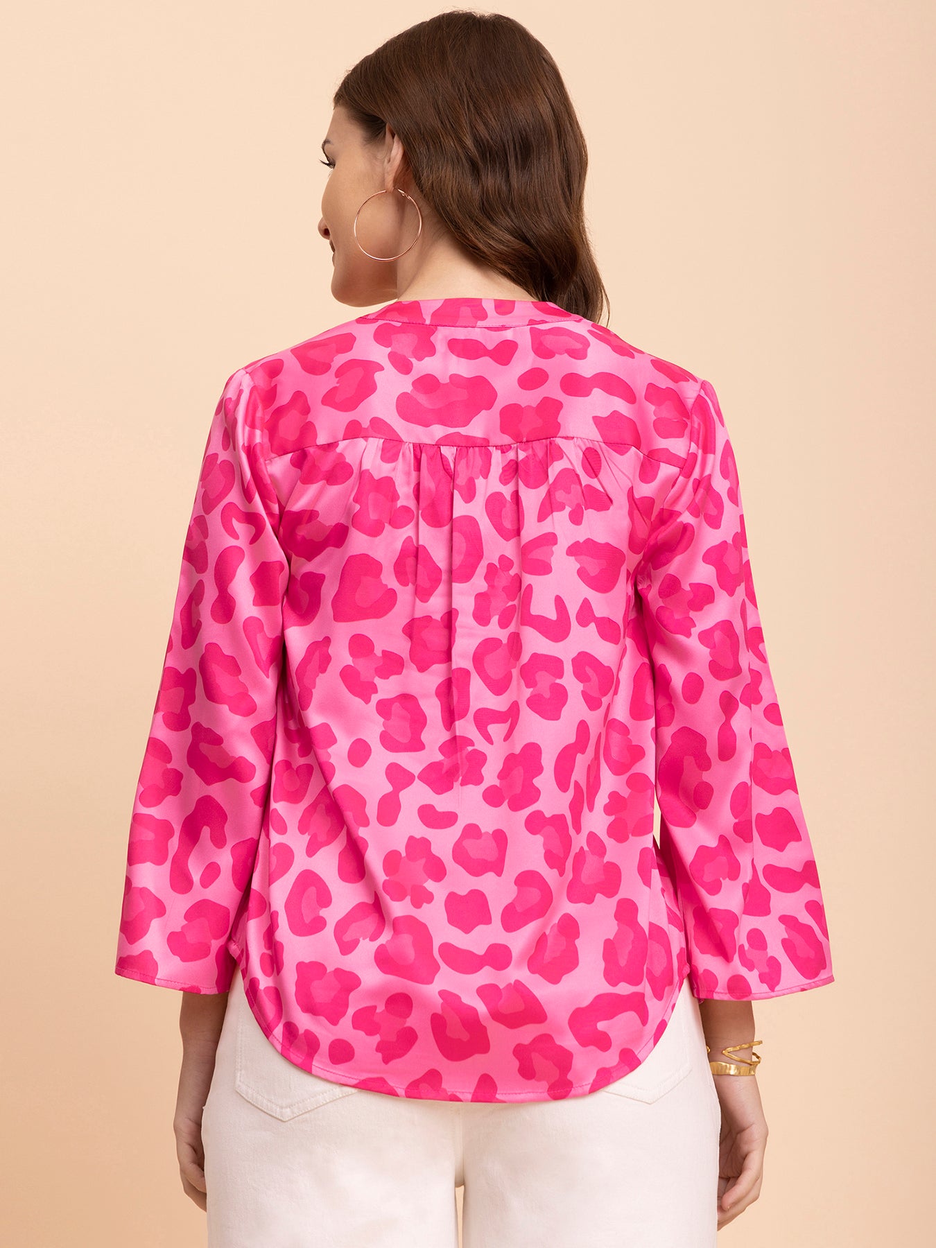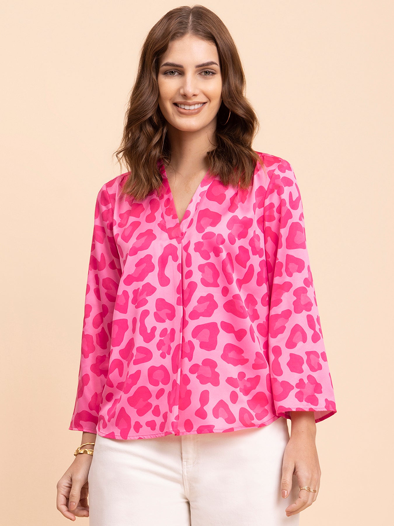 This fuchsia and pink top has animal print. It has front pleat detail with V-neck and bell sleeves. Made from Satin, it is soft and comfortable to wear.