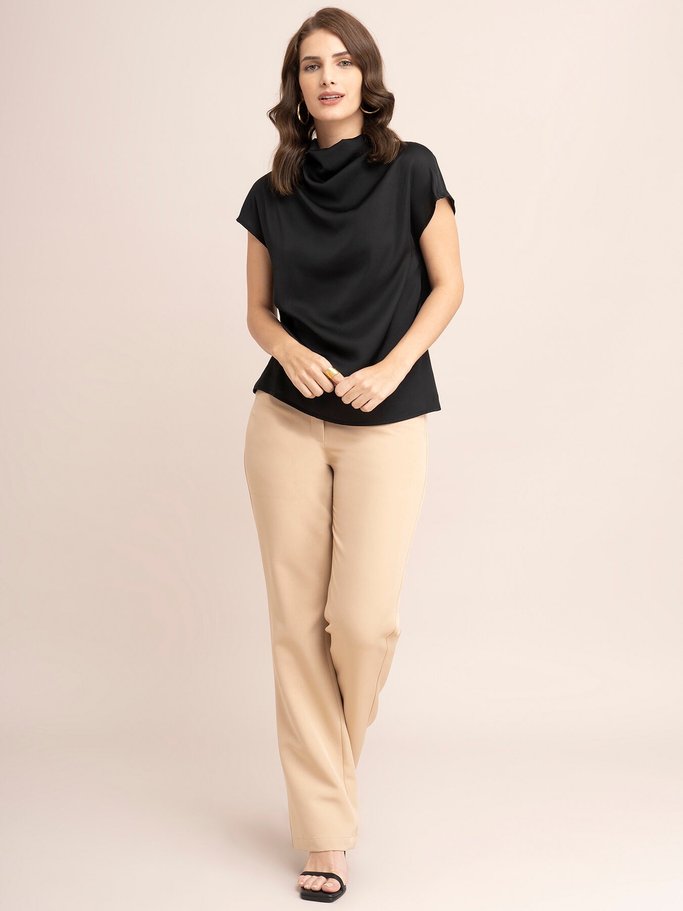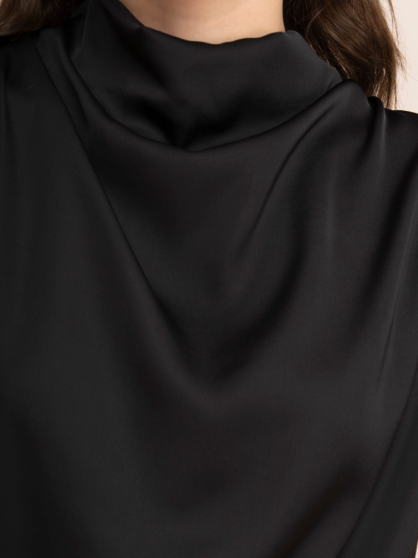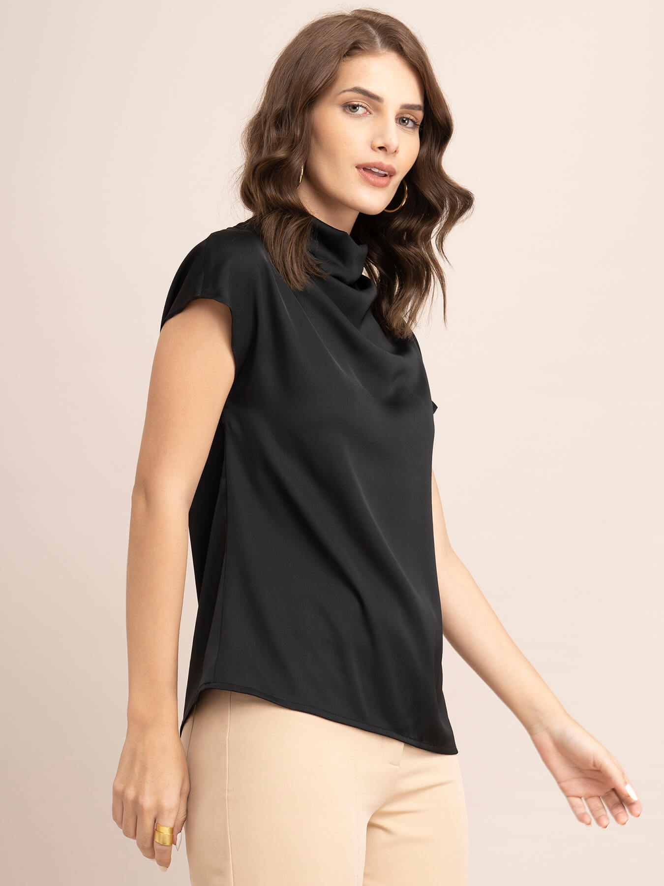 This black top has a cowl neck, and short sleeves. Made from Satin, it is soft and comfortable to wear.