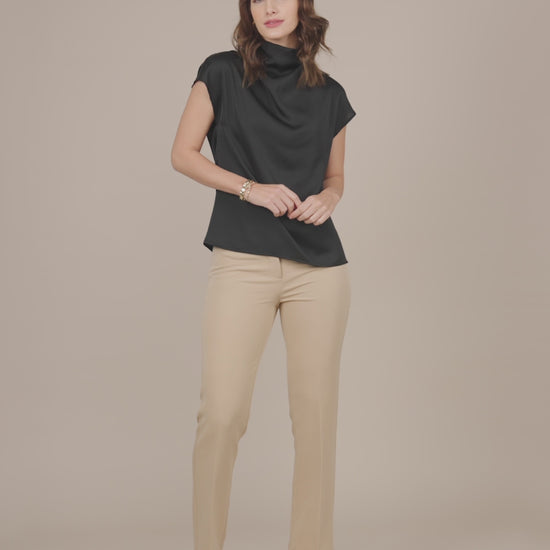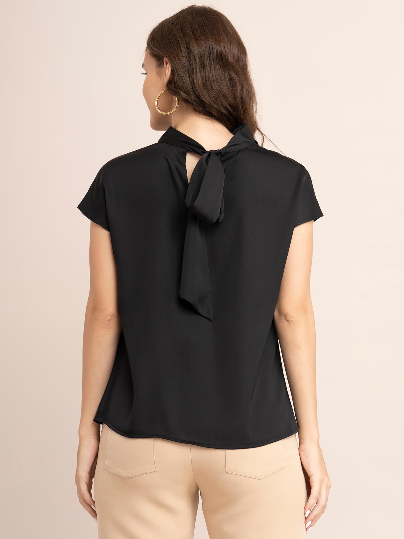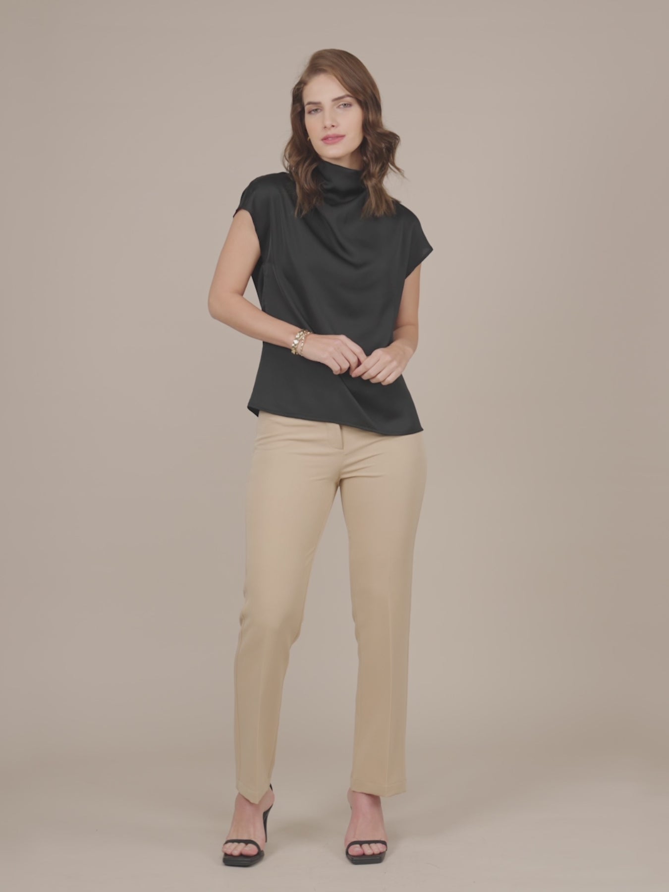 This black top has a cowl neck, and short sleeves. Made from Satin, it is soft and comfortable to wear.