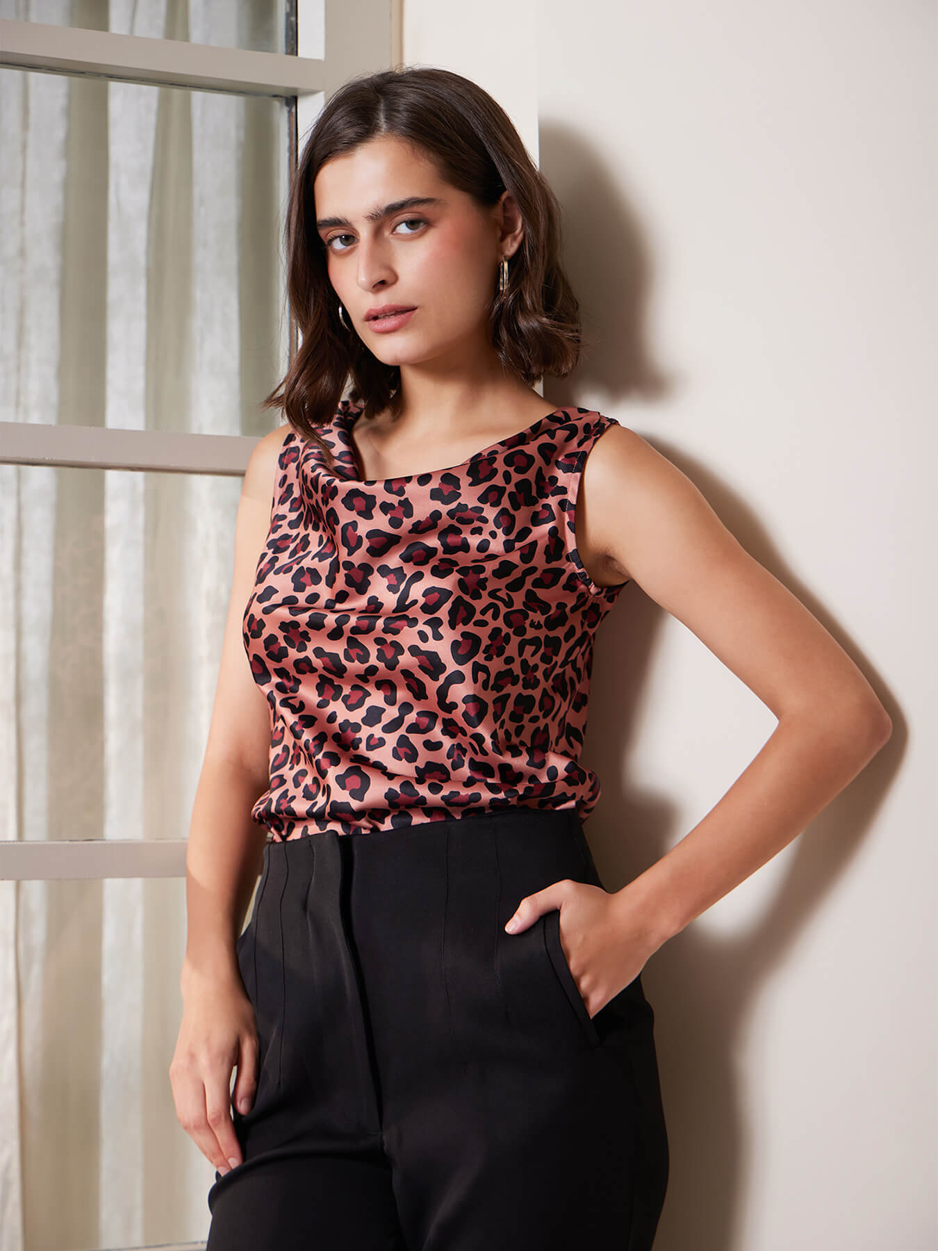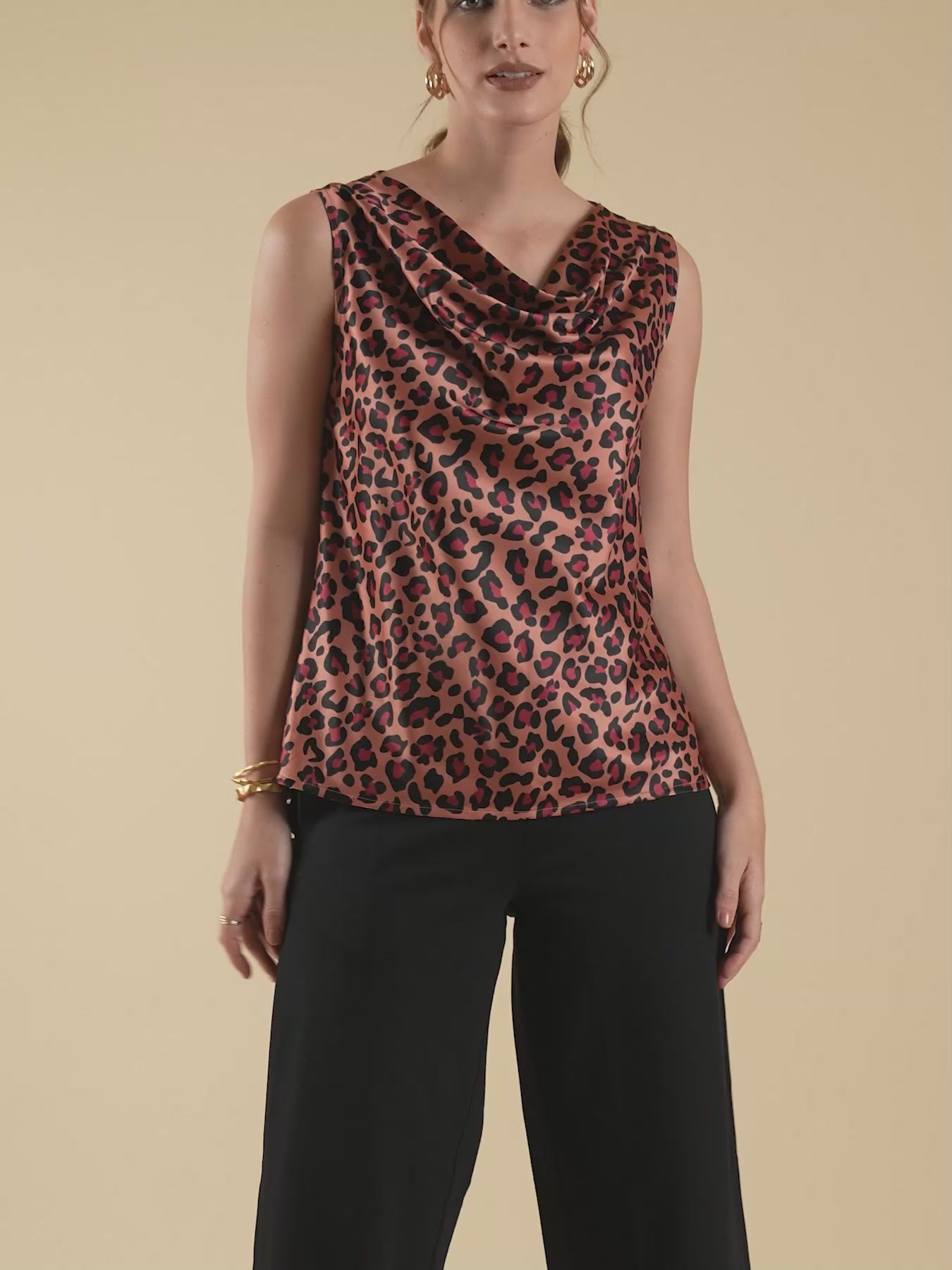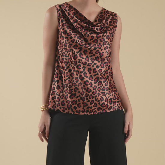 This brown and black top has animal print. It has cowl neck and sleeveless. Made from Satin, it is soft and comfortable to wear.