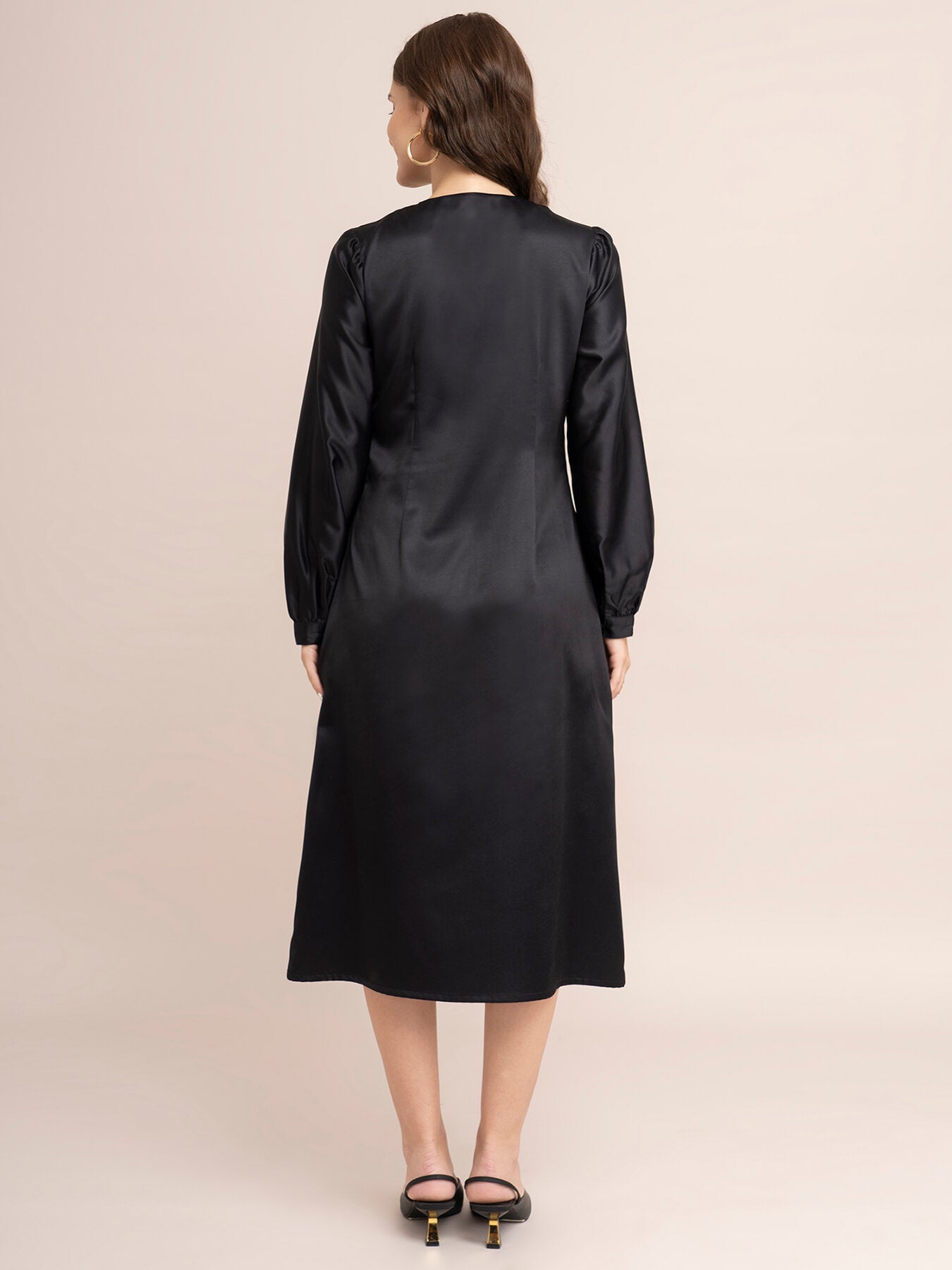 This black and green A-line dress has a tie-up neck, floral print, and three-quarter sleeves. Made from Satin, it's immensely soft and comfortable to wear.