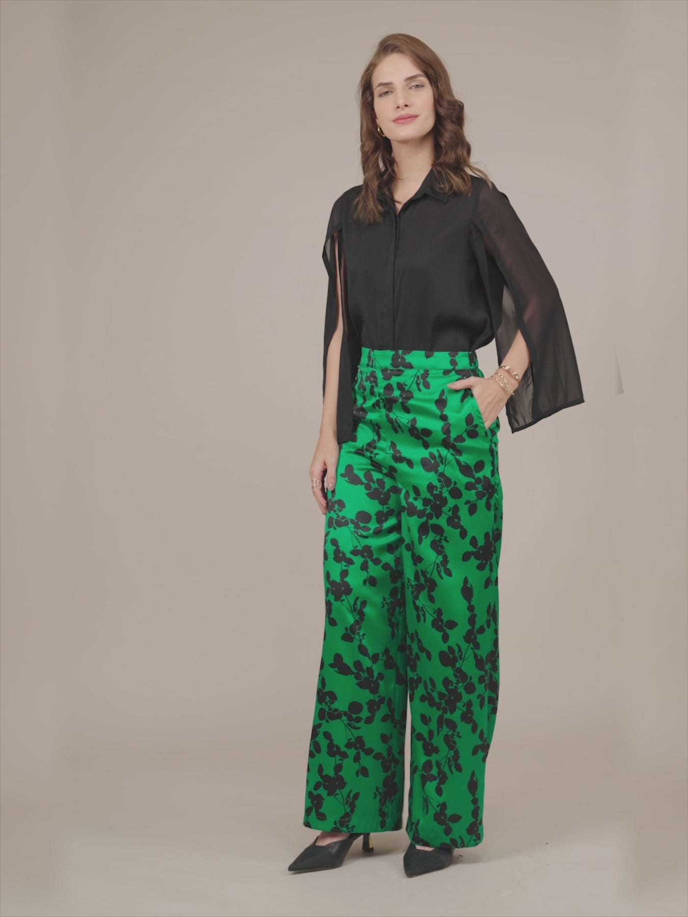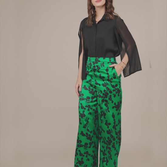 These green and black wide legged trousers have floral print and mid-rise waist. Made from Satin, it is soft and comfortable to wear.