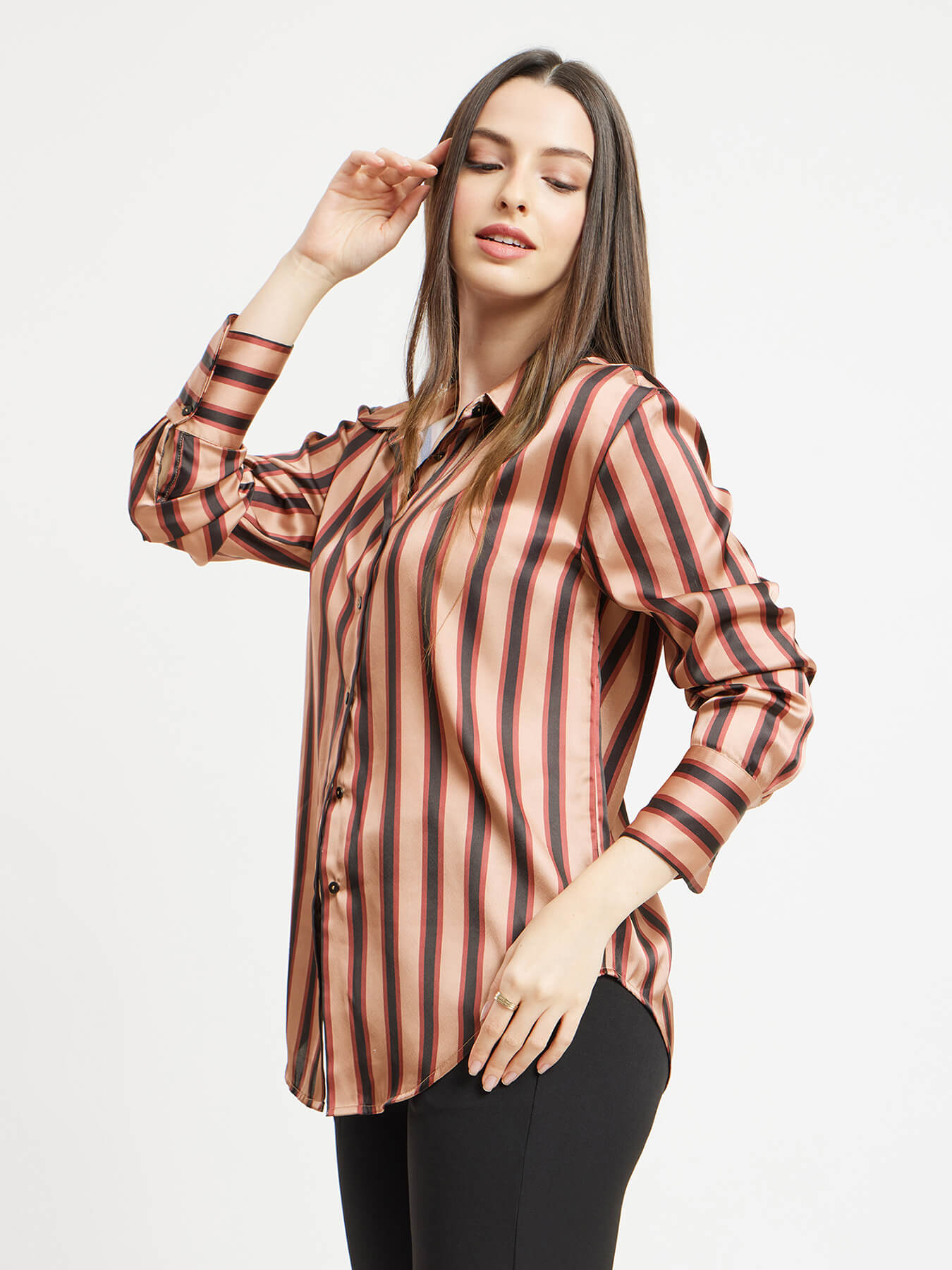 Satin Stripes Shirt - Brown And Beige