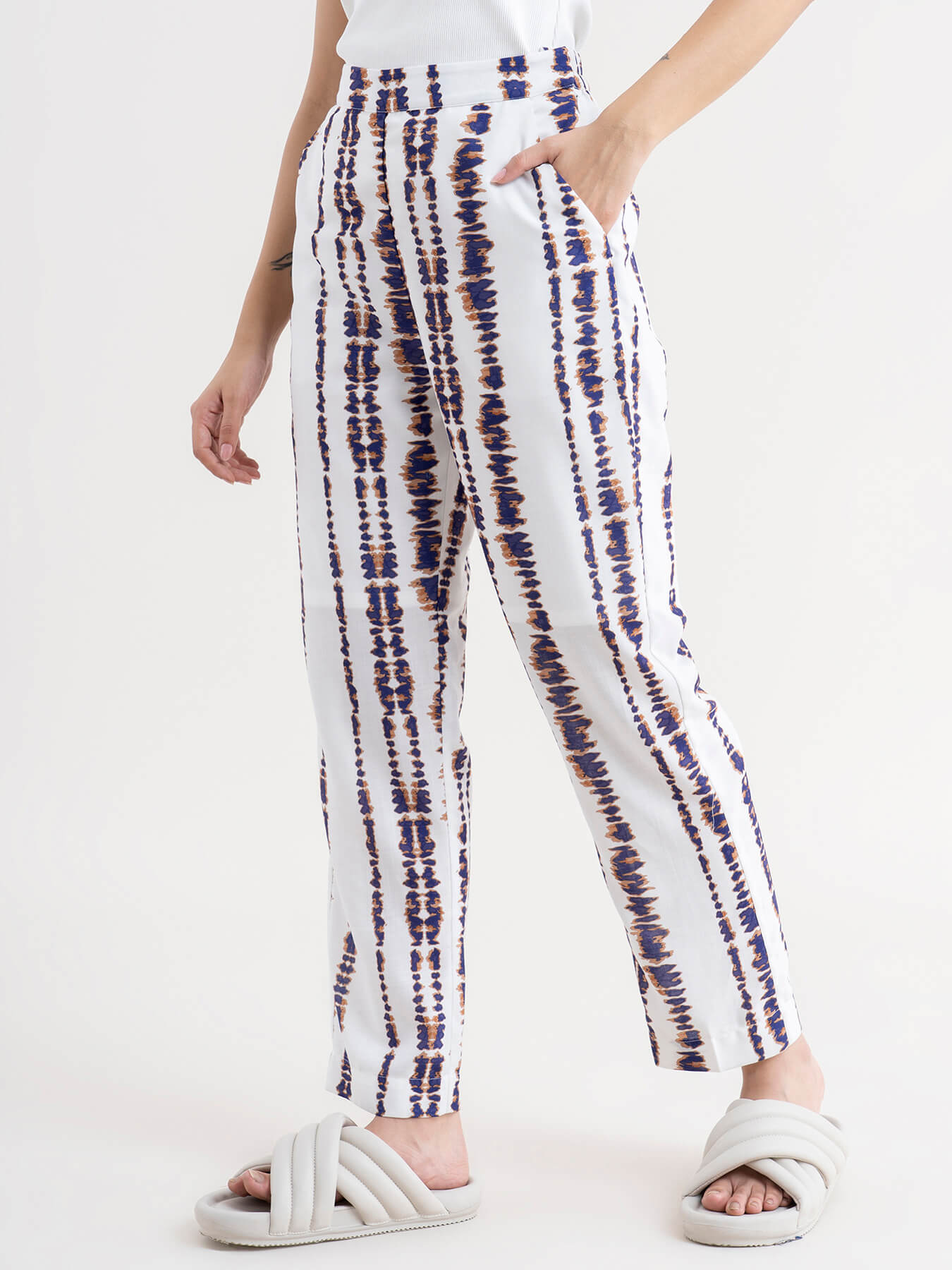 These white & blue straight-fit trousers have ankle length and mid-rise waist. Made with Polycotton, these stretchable trousers have an elasticated waistband.