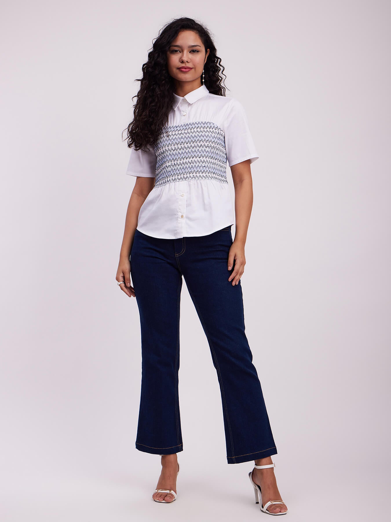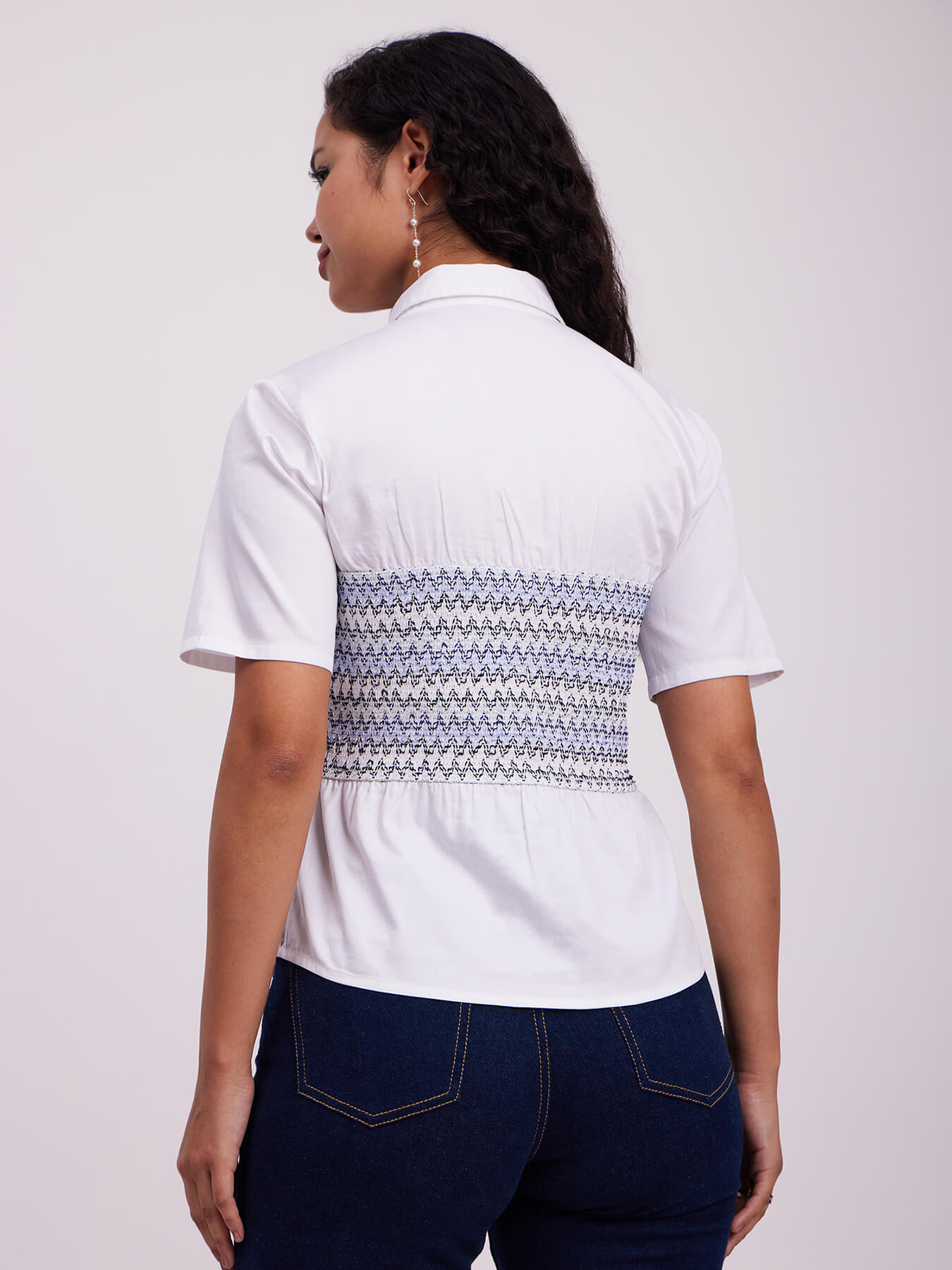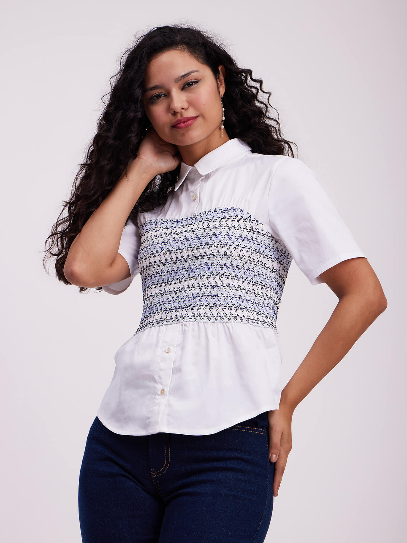 This white smocking top has a shirt collar and short sleeves. Made from Cotton Satin, it is soft and comfortable to wear.