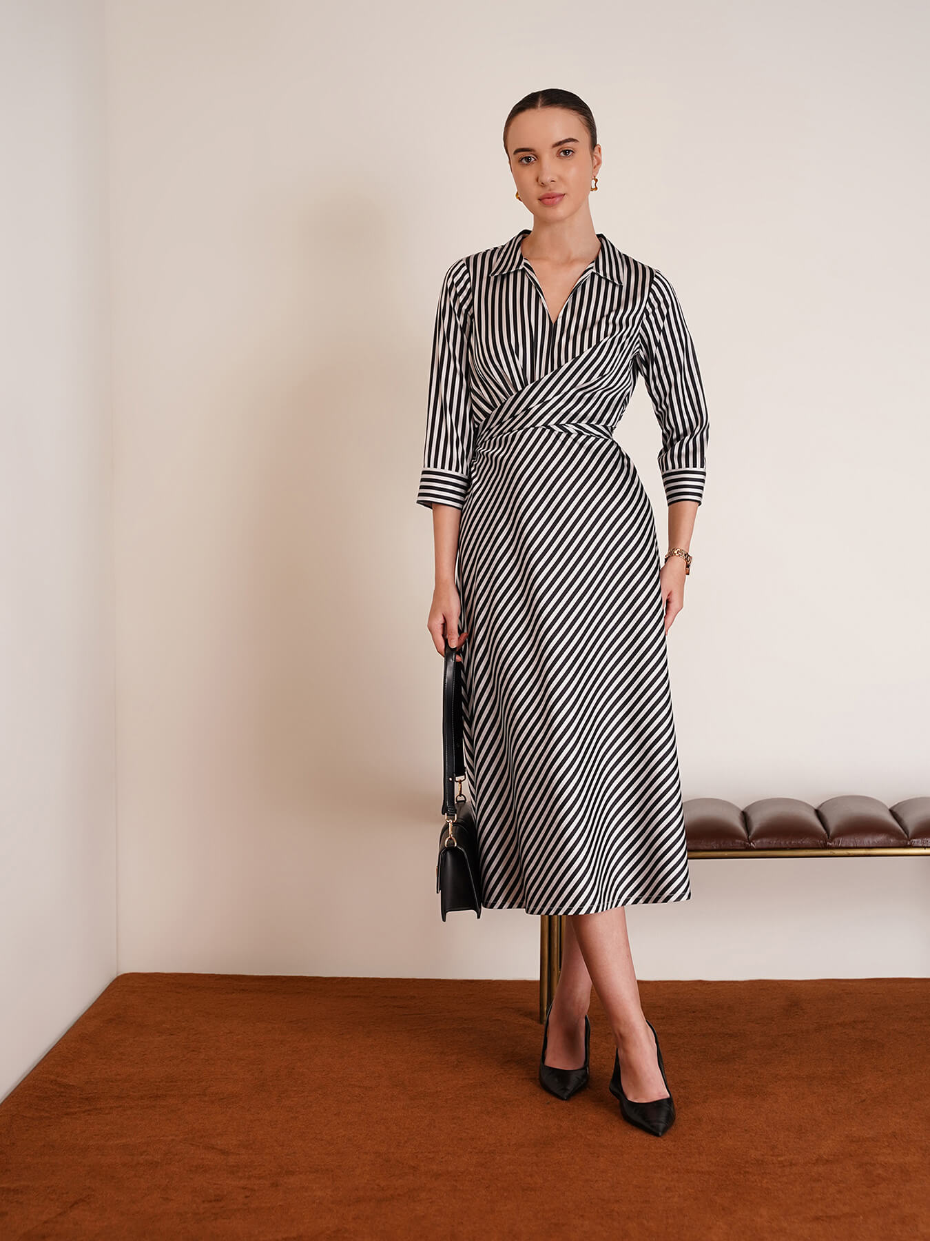 Stretchable Satin Striped Dress - Black