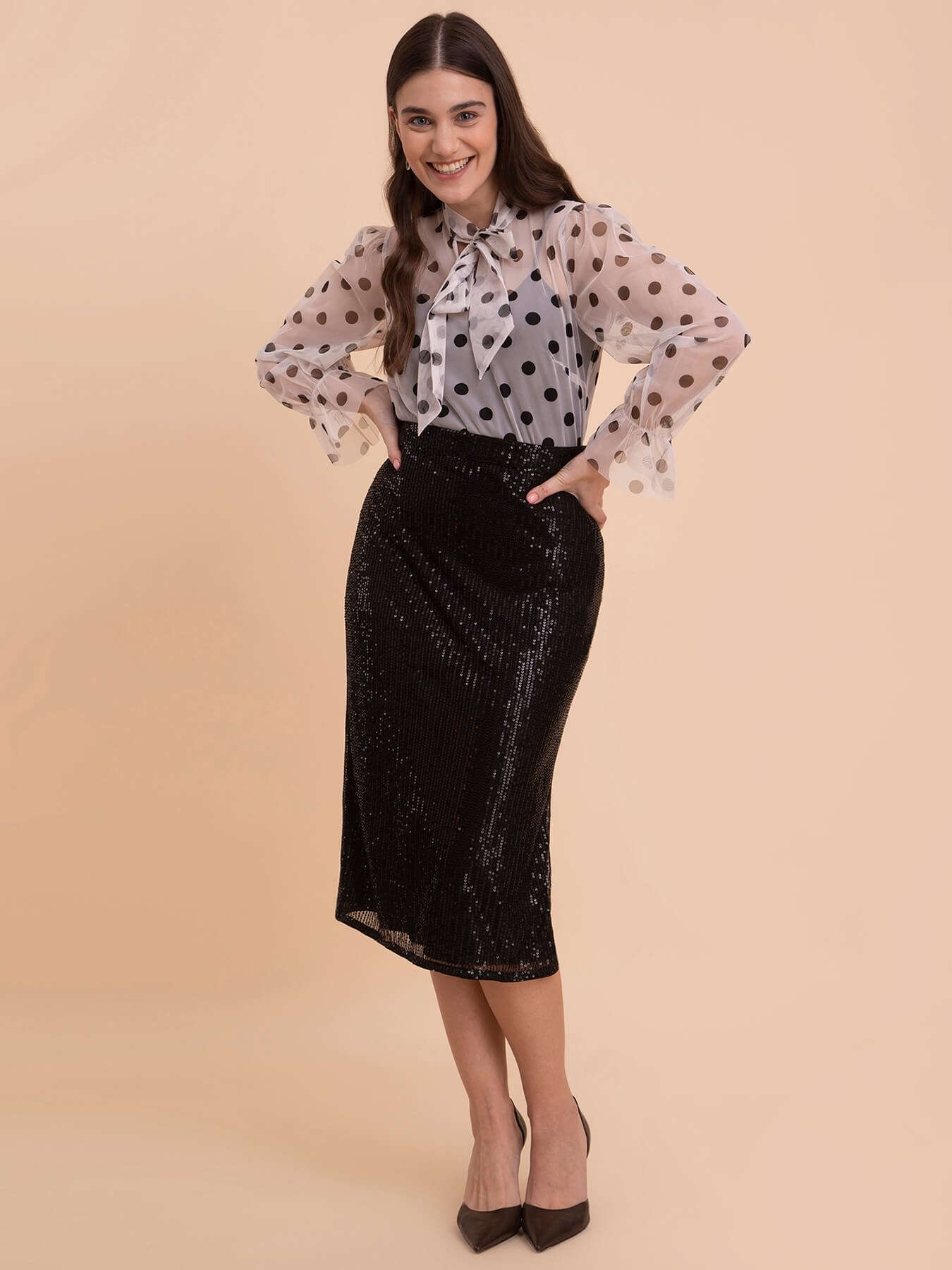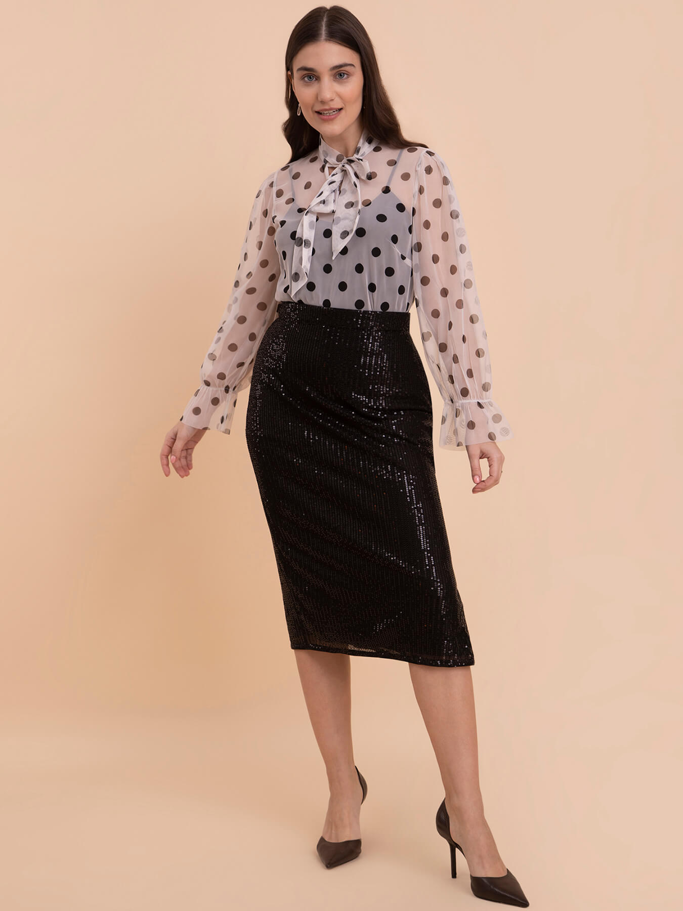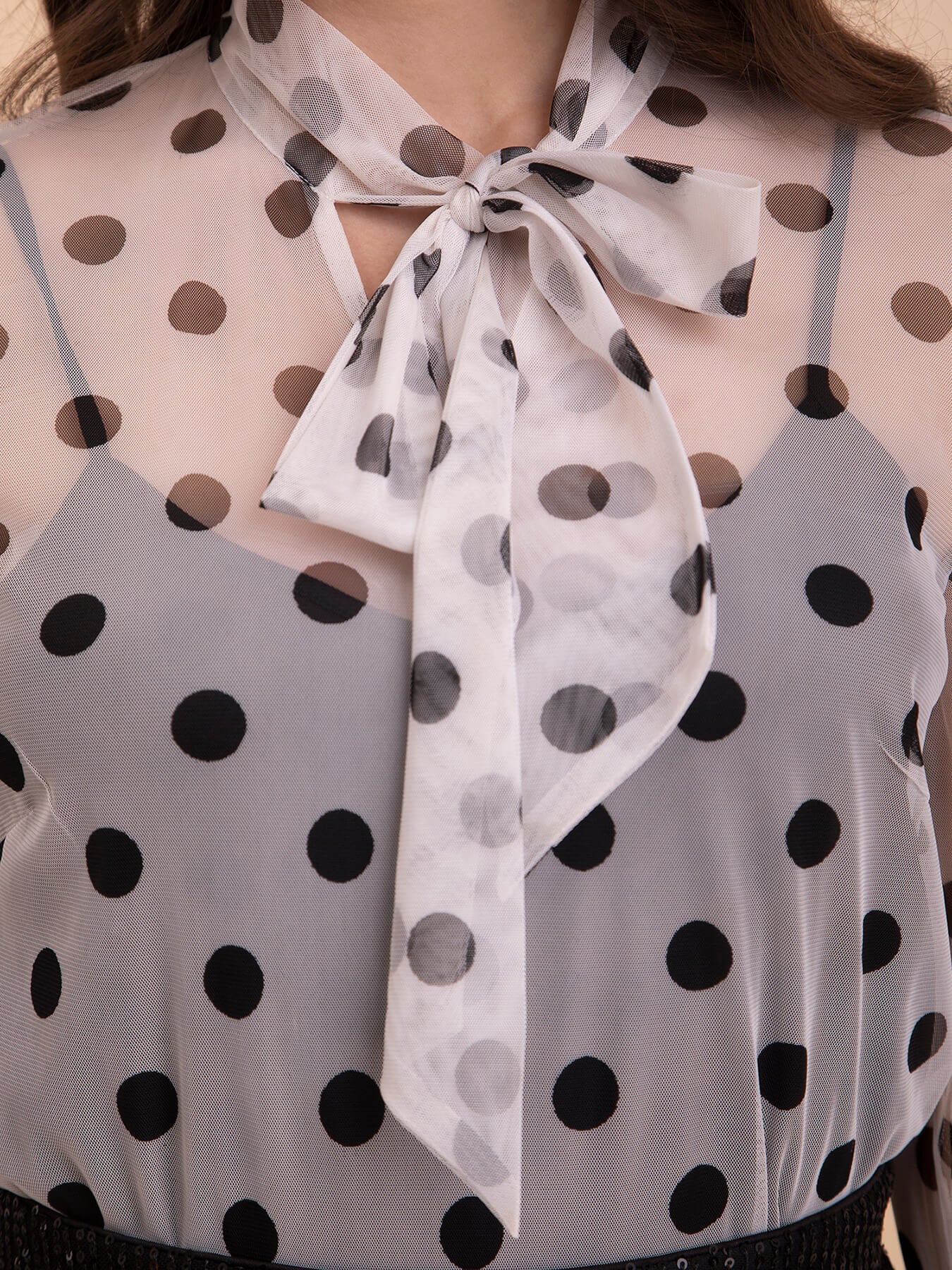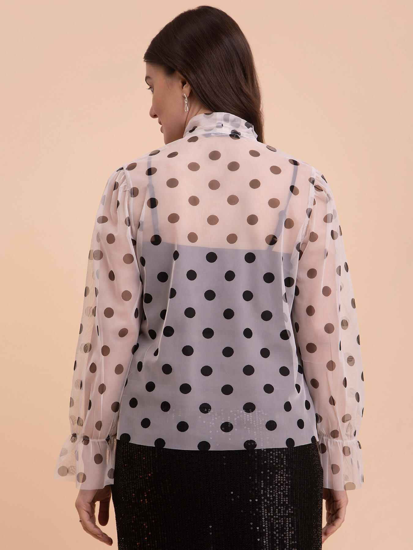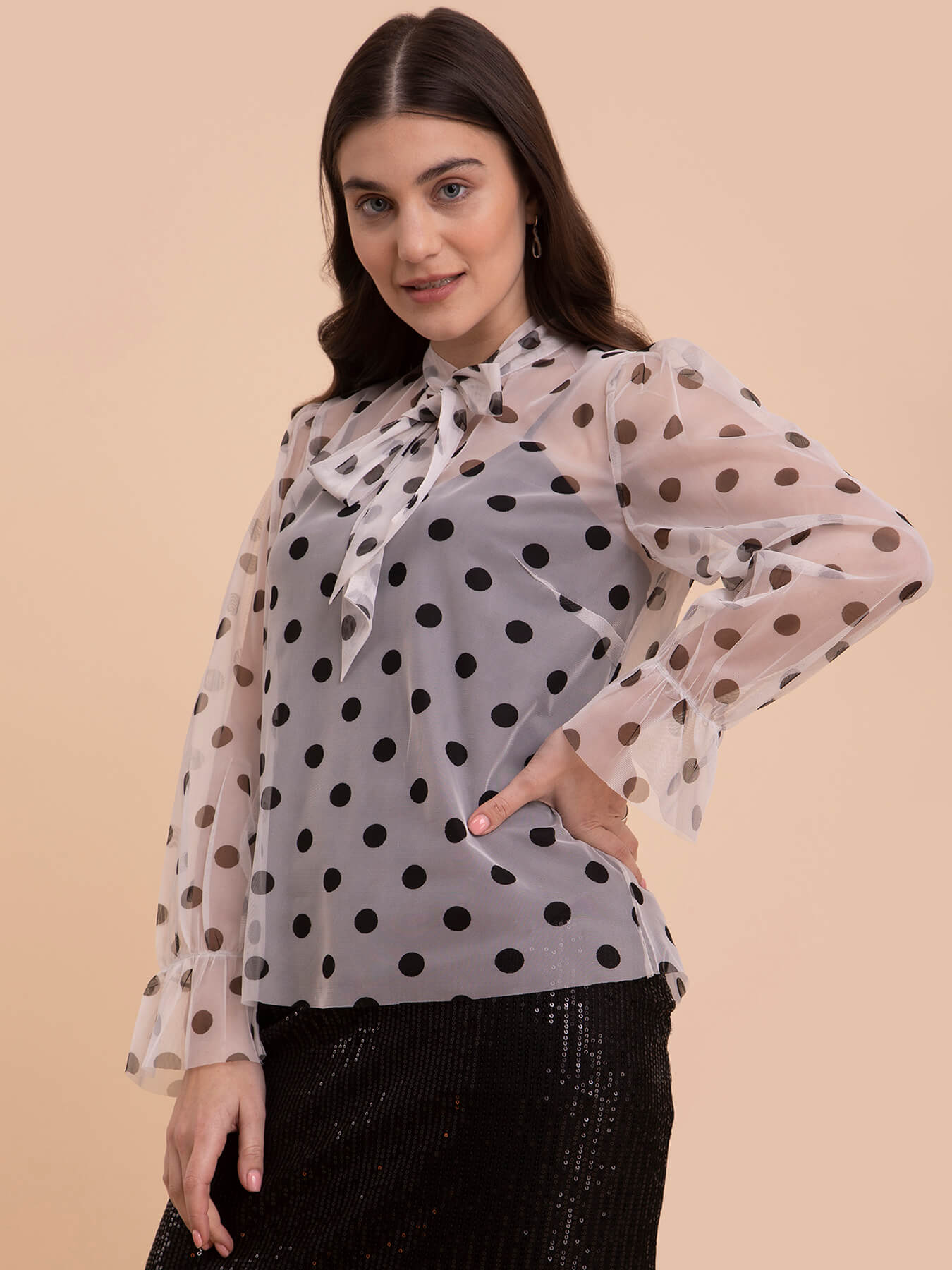 This white and black top has a polka print and bow tie up neck. It has long sleeves and relaxed fit. Made from Net, it is soft and comfortable to wear.