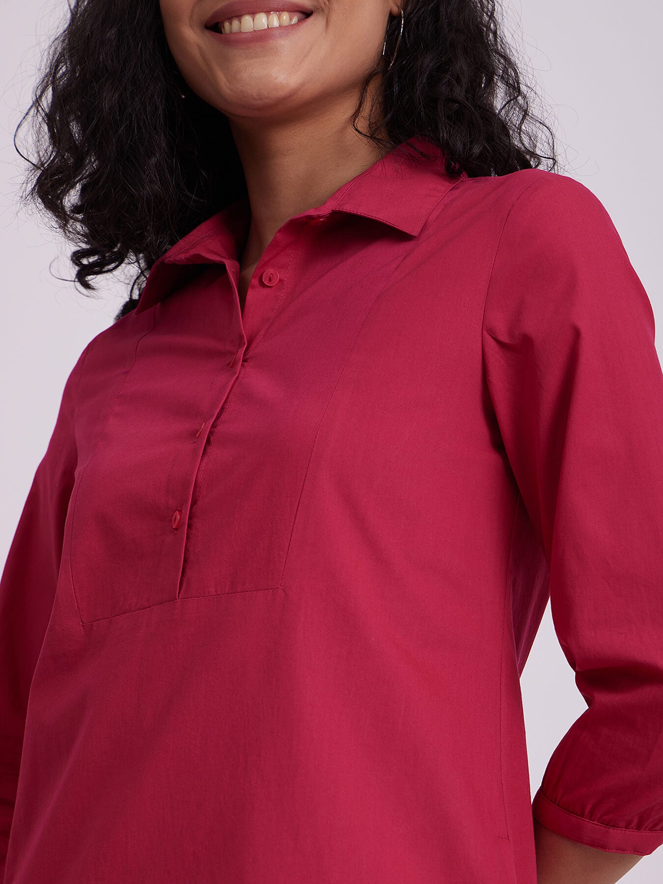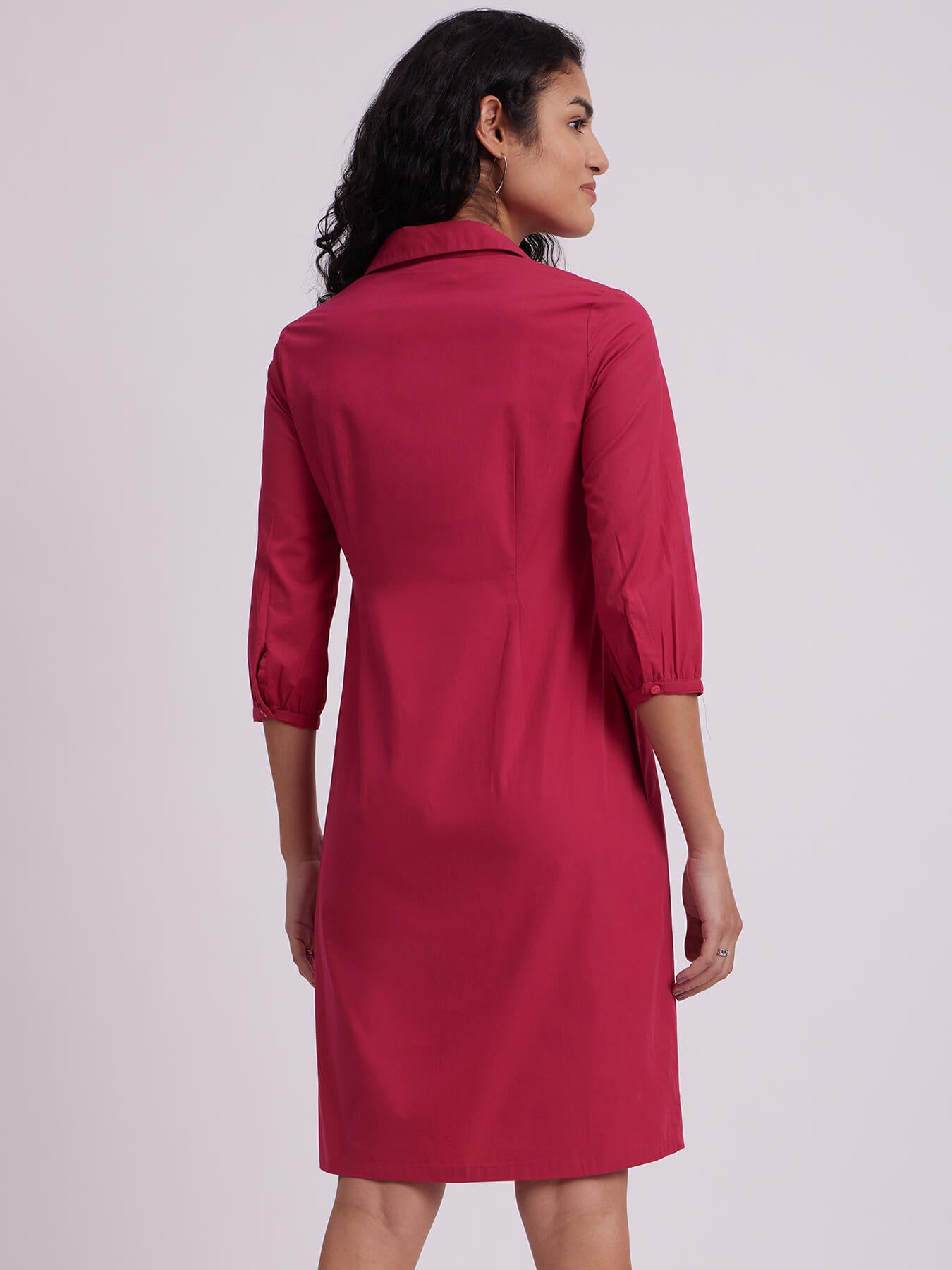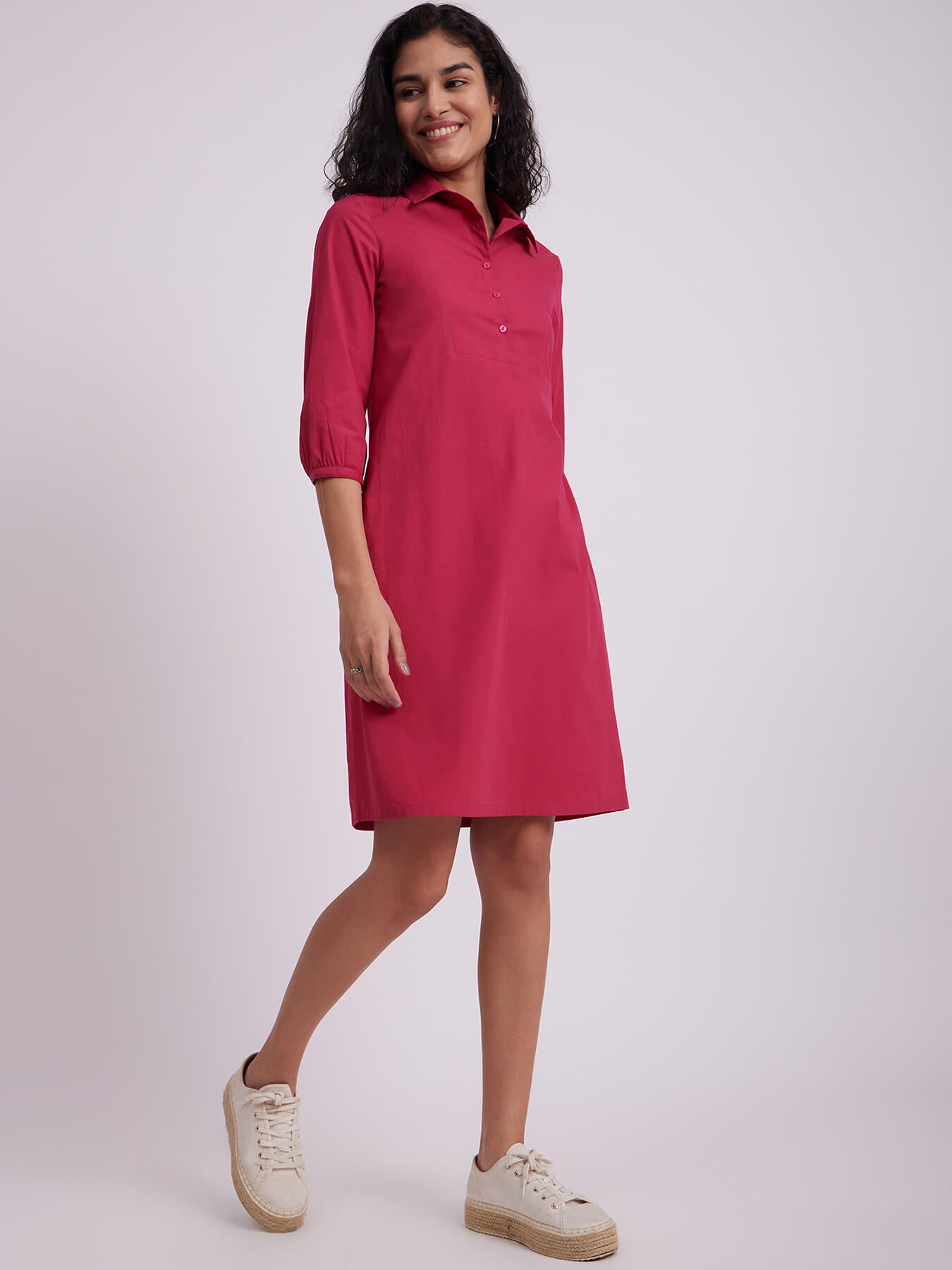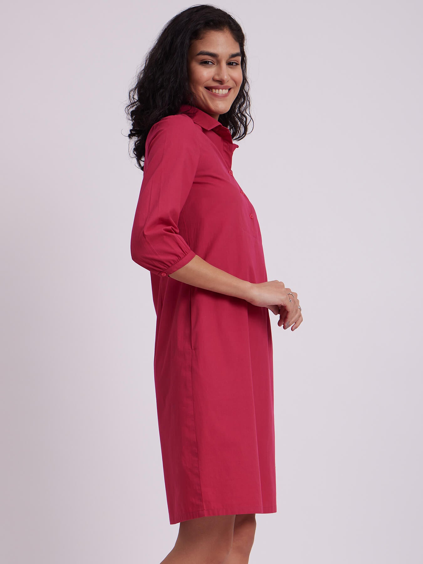 This fuschia dress has a shirt collar and tie-up sleeves. Made from Cotton Satin, it is soft and comfortable to wear.