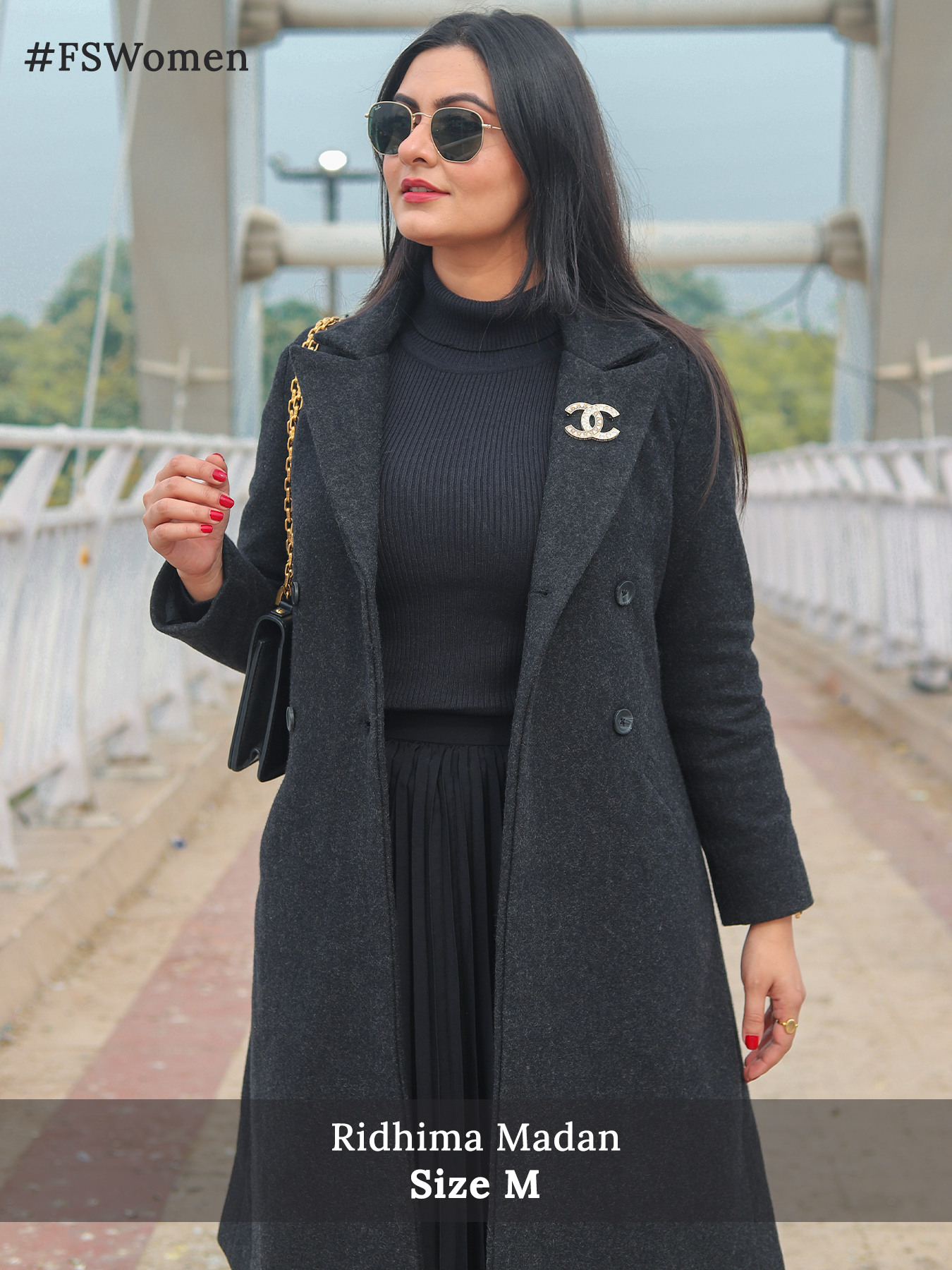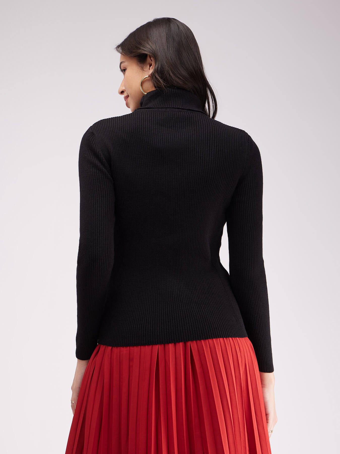 This black, ribbed sweater has a turtleneck and full sleeves. Made from Cotton-Viscose blend, it is breathable, comfortable and stretchable.