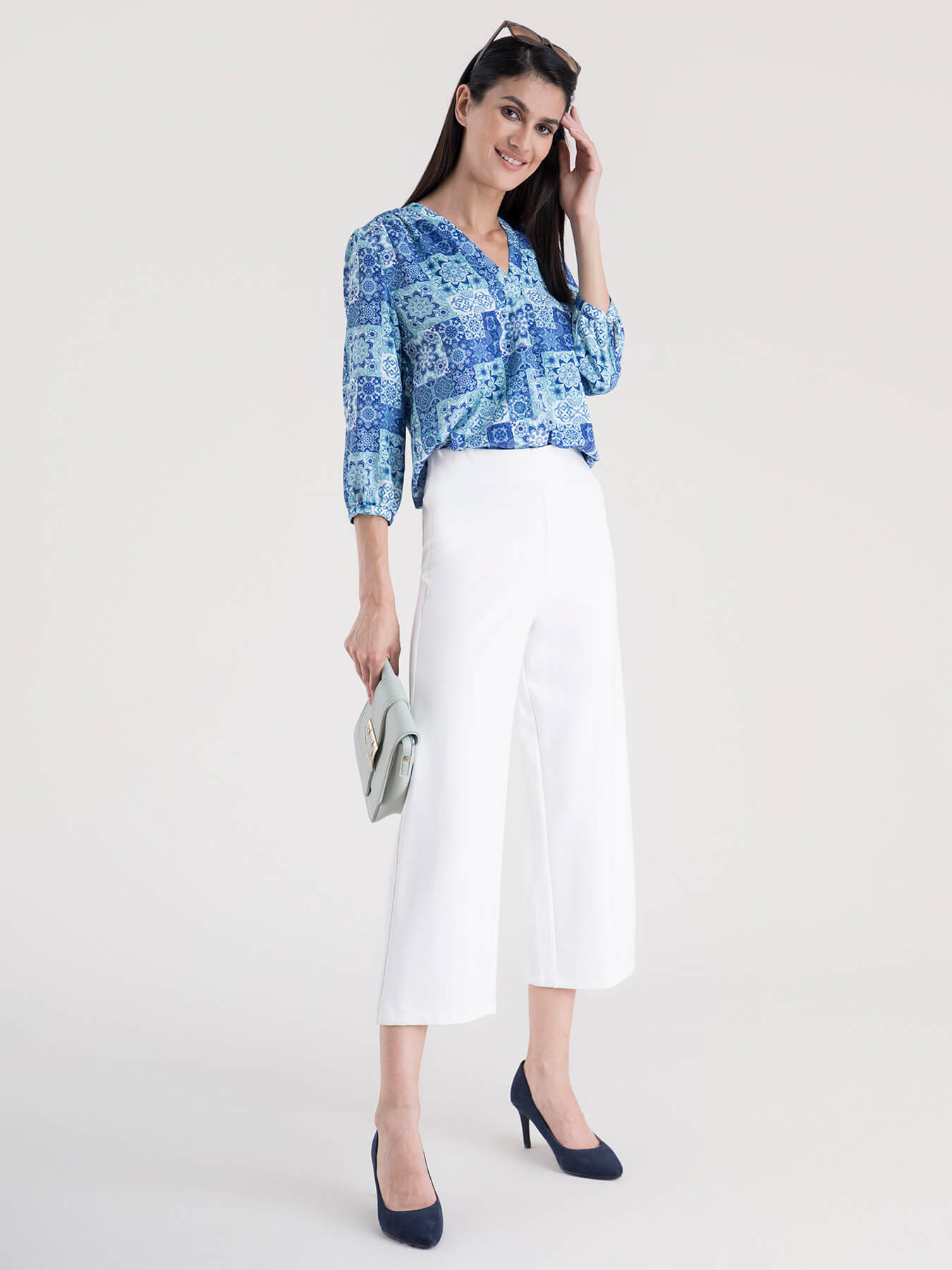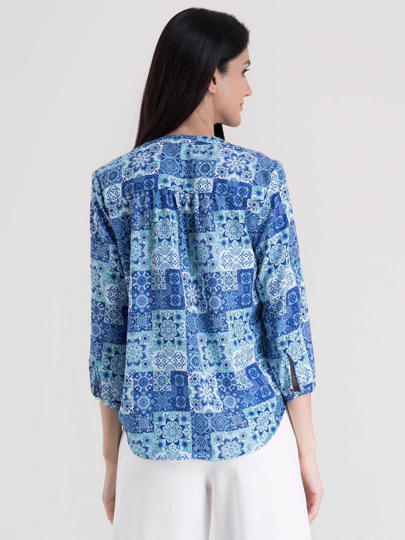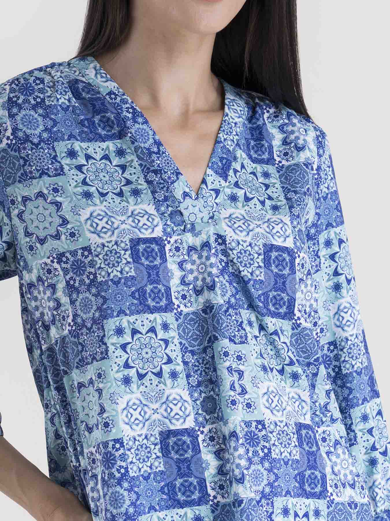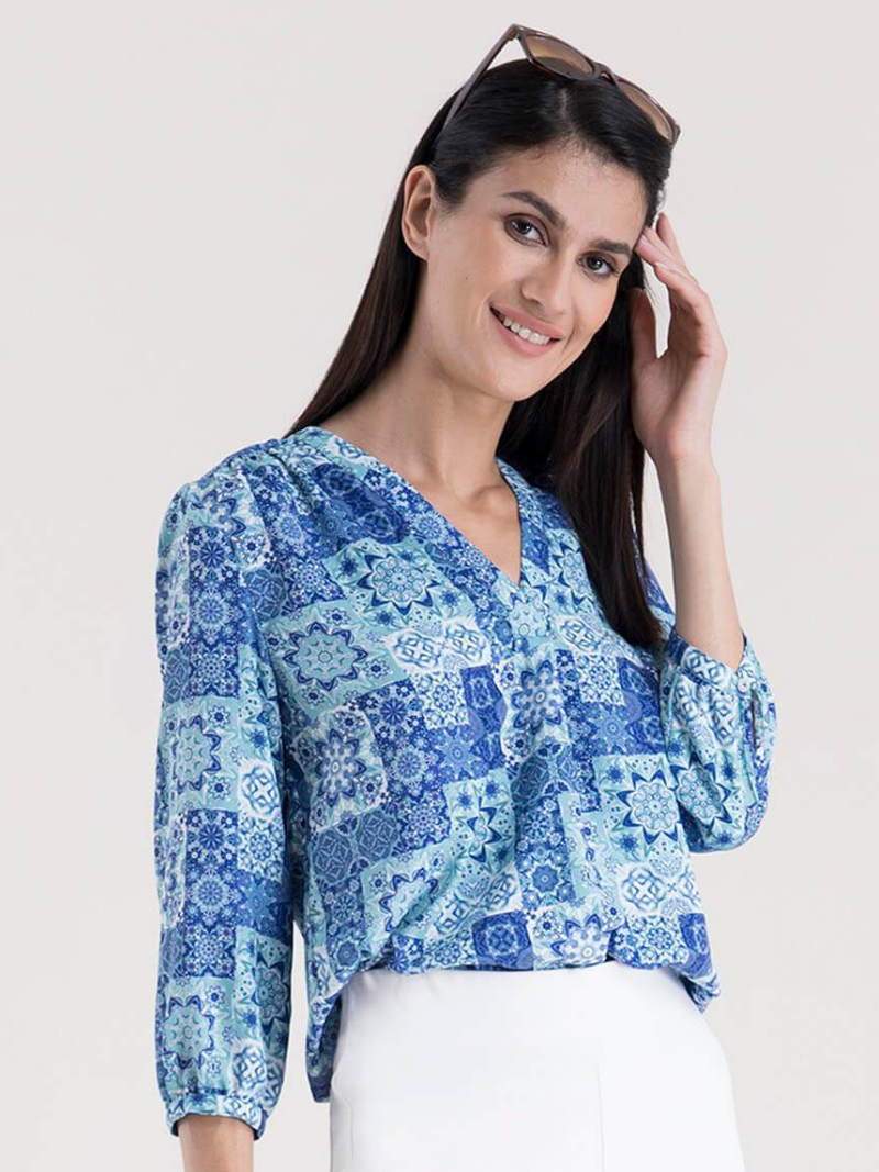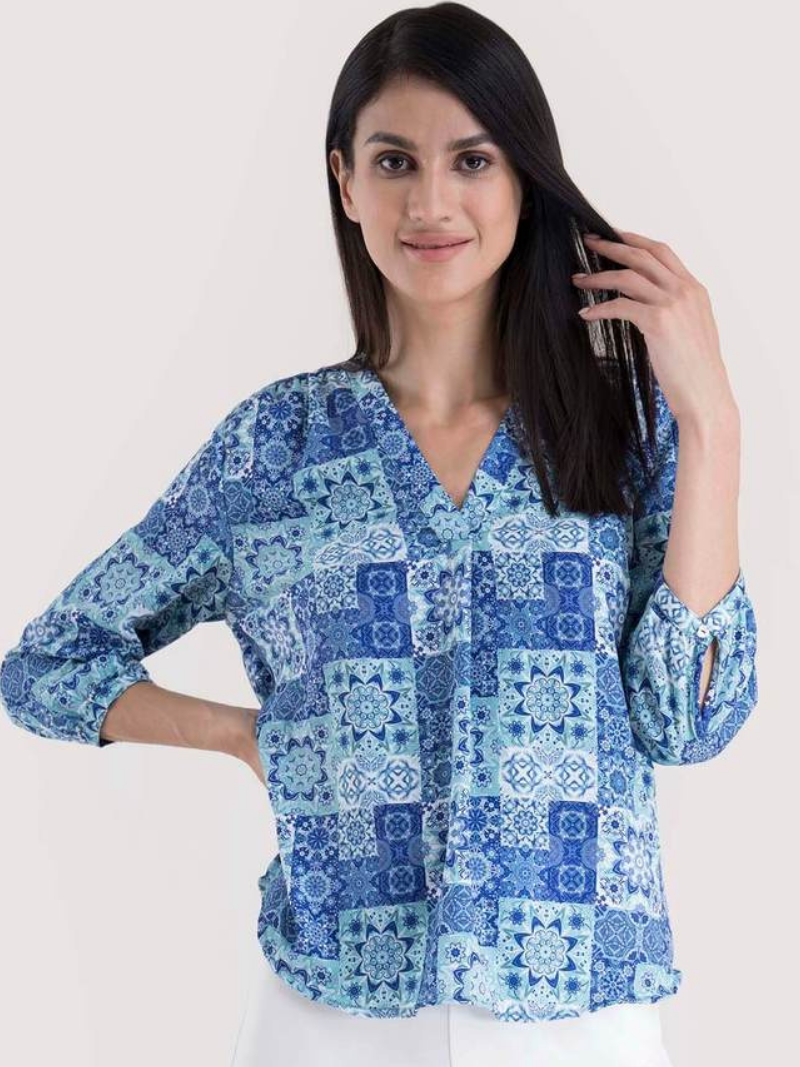 This blue abstract print top has a V-neck and 3/4th sleeves.