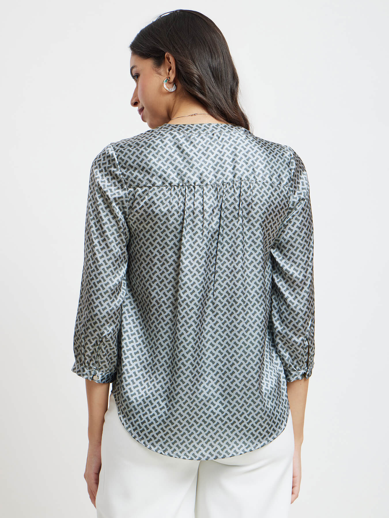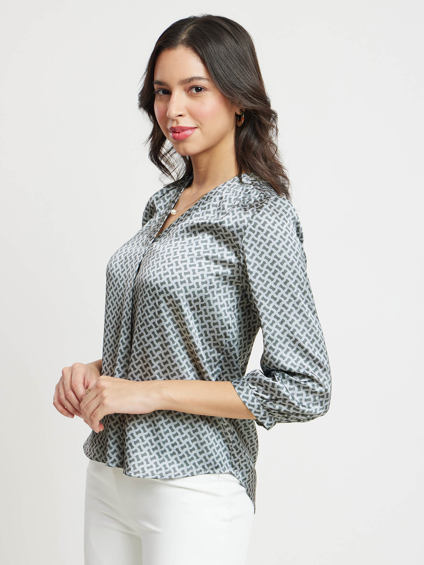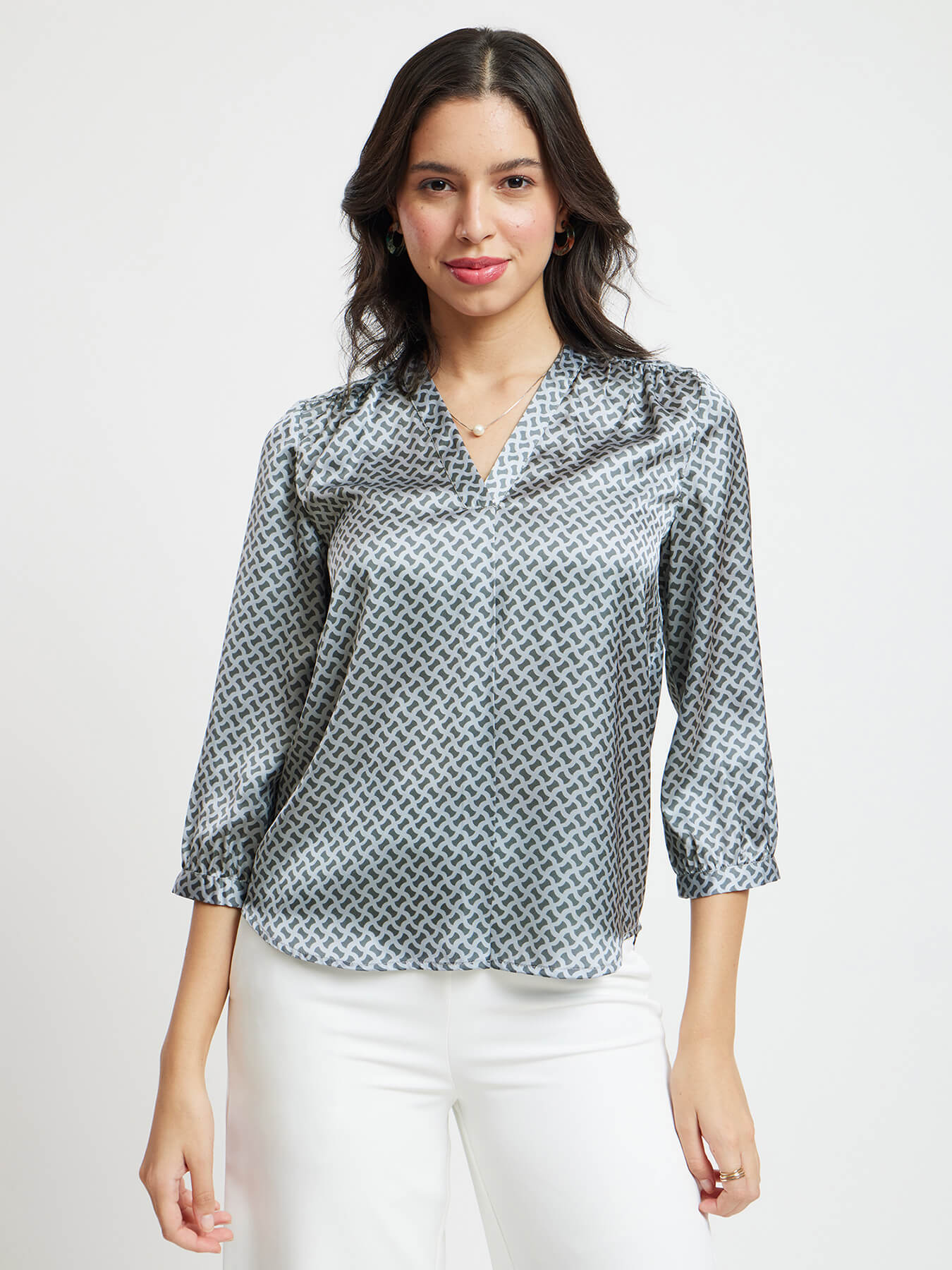 V Neck Geometric Print Top - Grey