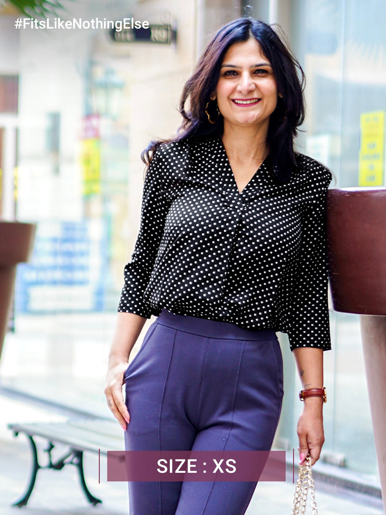 This black and white top has polka dots, V neck, ¾ sleeves and button for closure. Made from fine Polyester Crepe, it's immensely soft with a flawless drape.