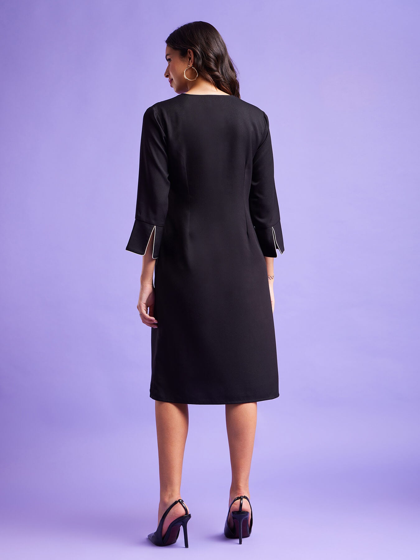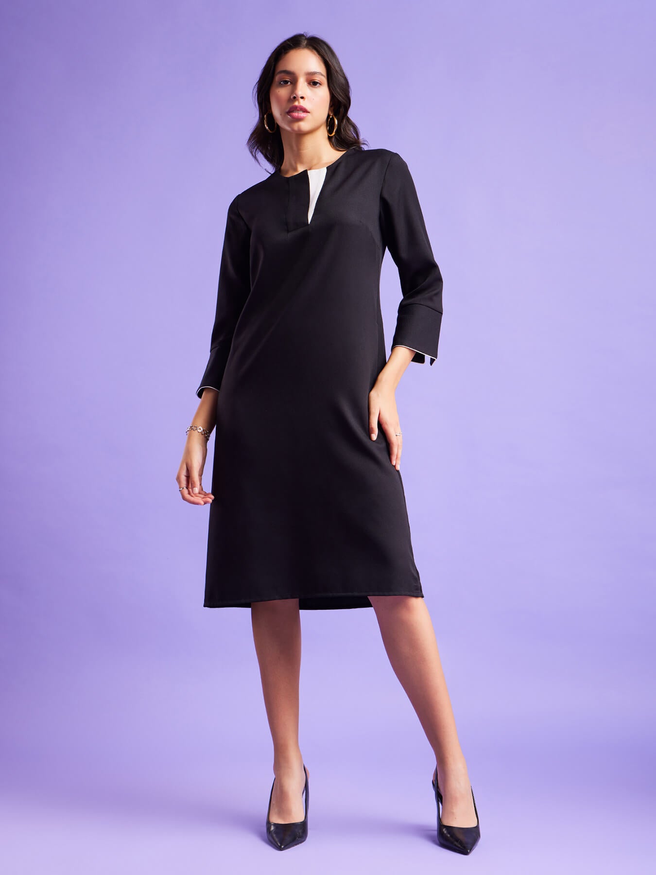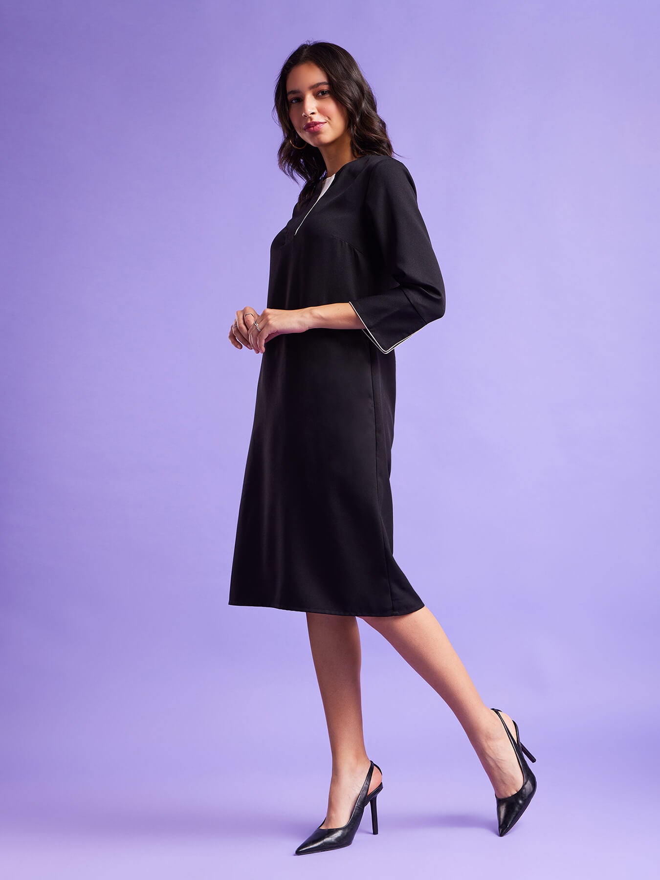 This black dress has a round neck and three-quarter sleeves. Made from Polyester Moss Lycra, it is soft and comfortable to wear.