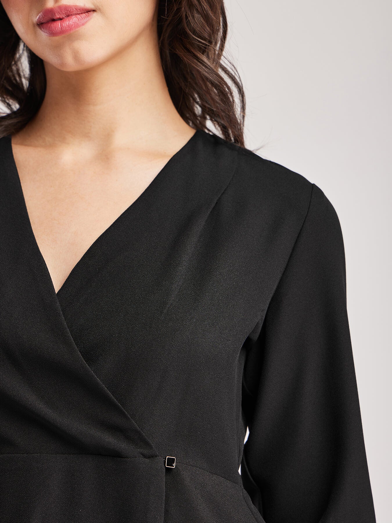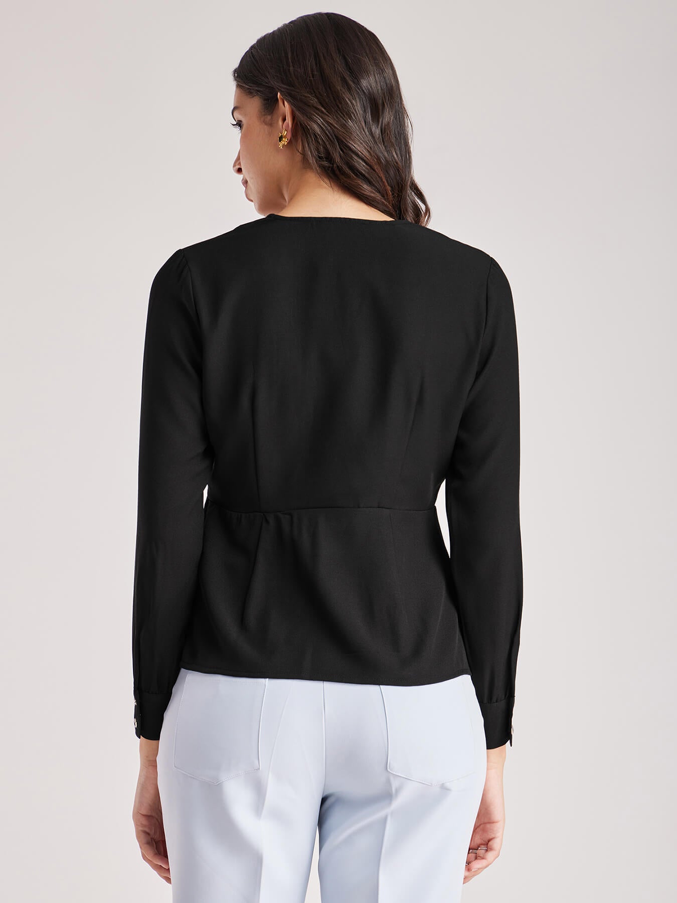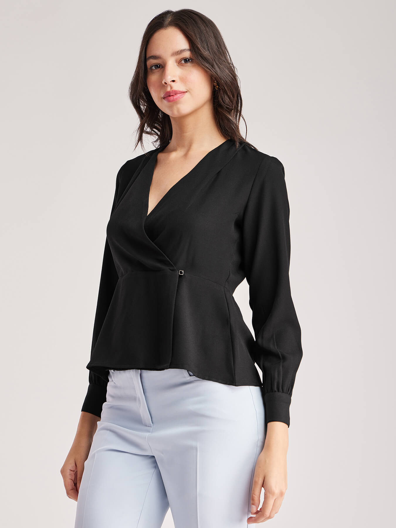 This black top has a V-neck and long sleeves. With a relaxed fit, this top has a wrap detail. Made from Polymoss, it is soft and comfortable to wear.