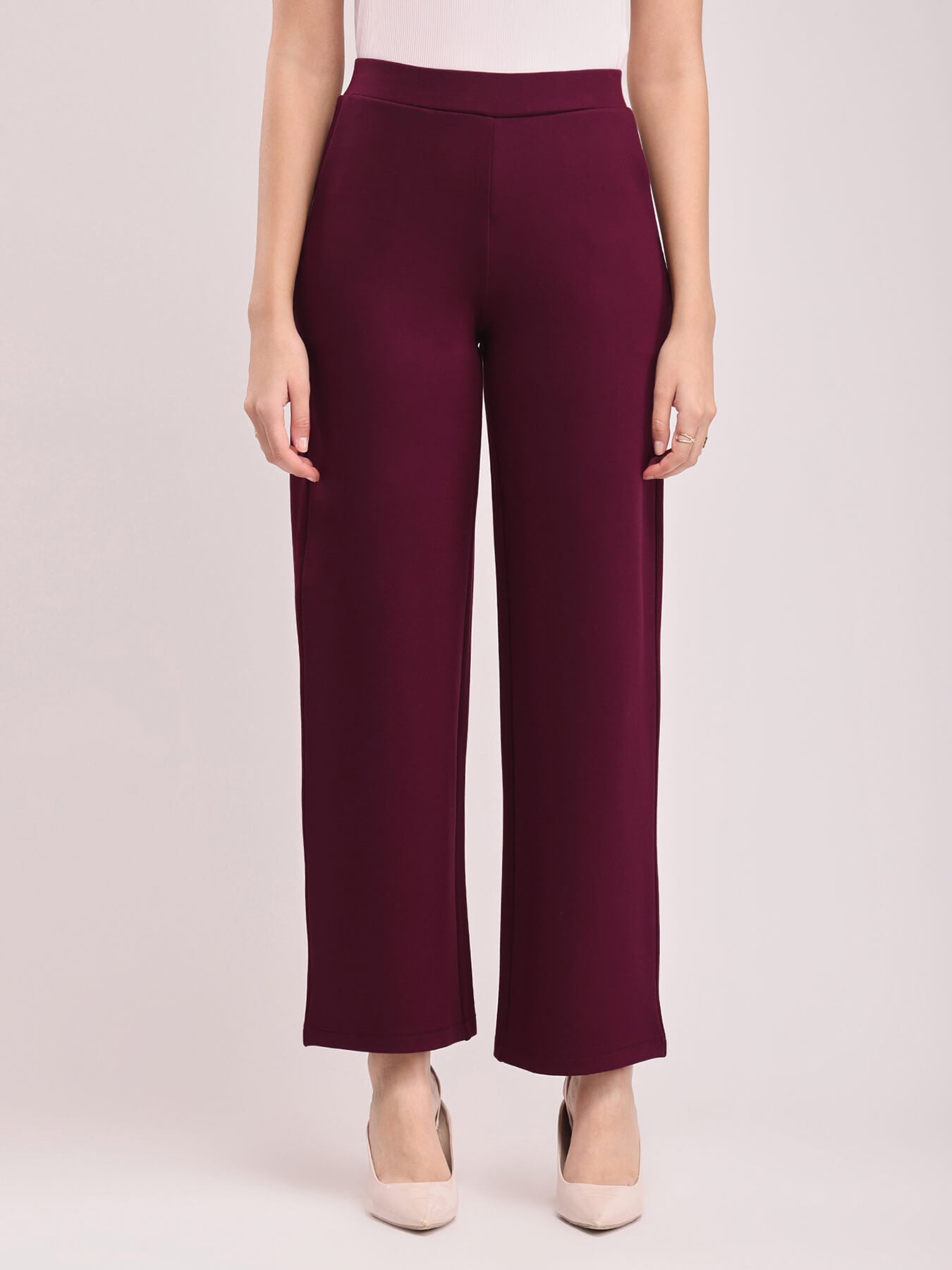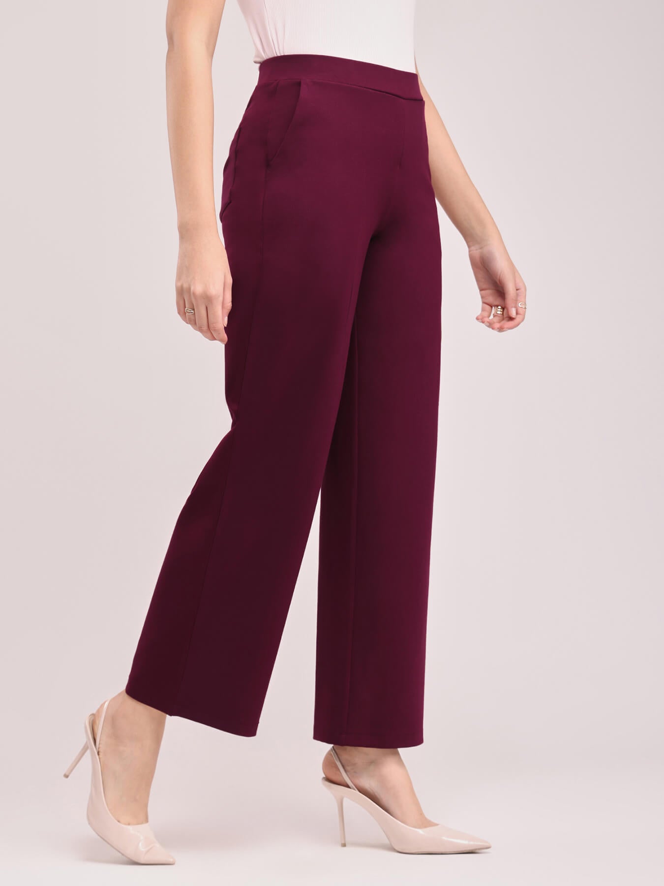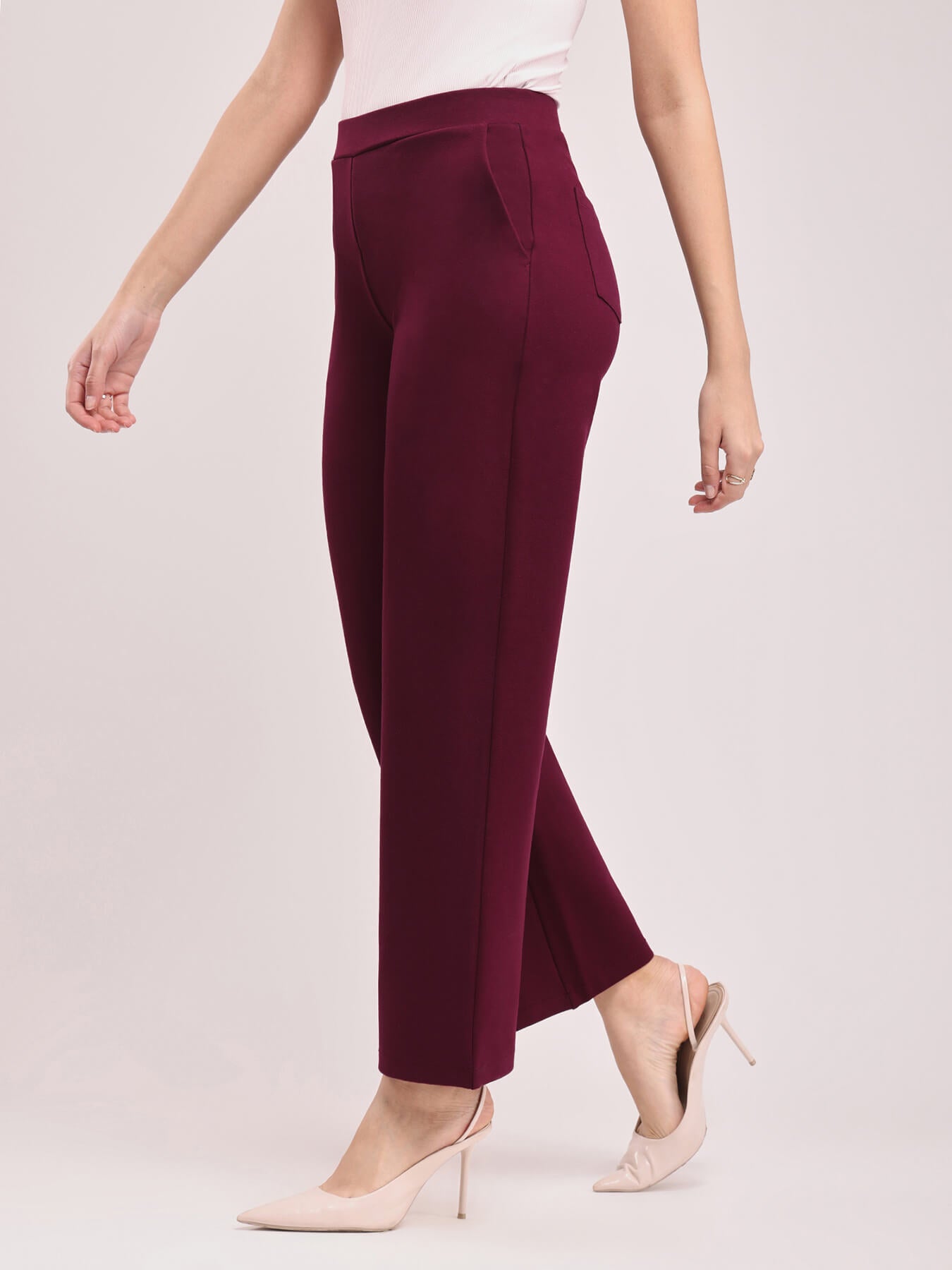 These maroon wide leg, high rise pants are made for the woman on the go. These pants have two front and two back pockets. A Nylon Rayon knit blend pull up pants, these are breathable, super stretchable, super soft, comfortable, anti-wrinkle and anti-pill. The hem of the pants is intended to fall according to the image on a height of 5'3" to 5'5". Colour may vary slightly according to screen settings and resolution.
