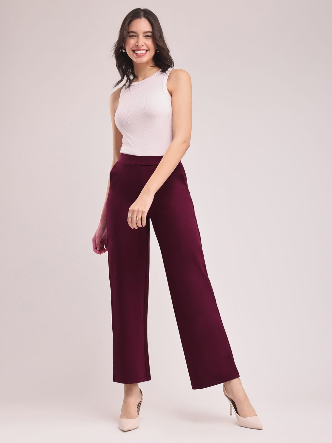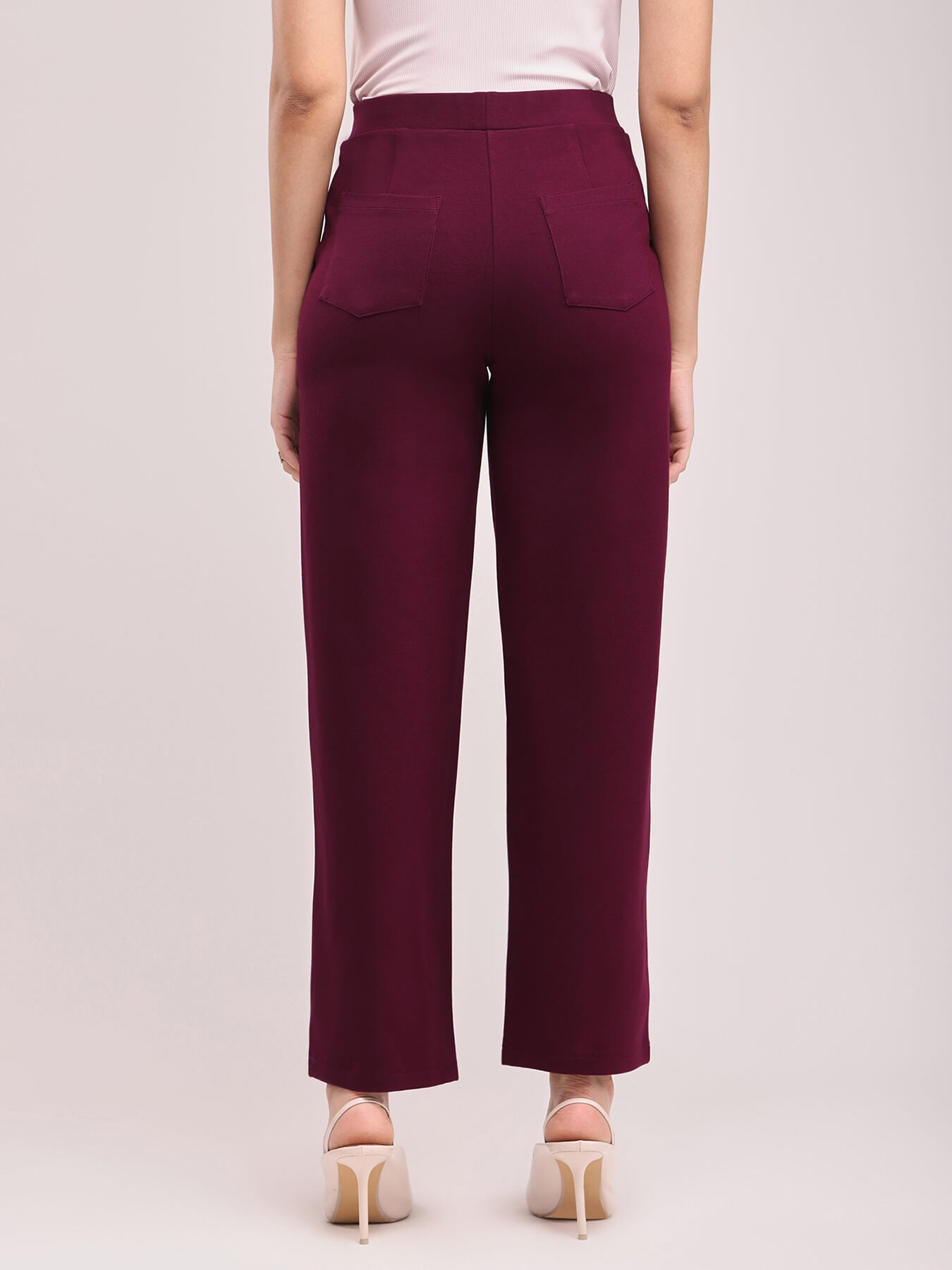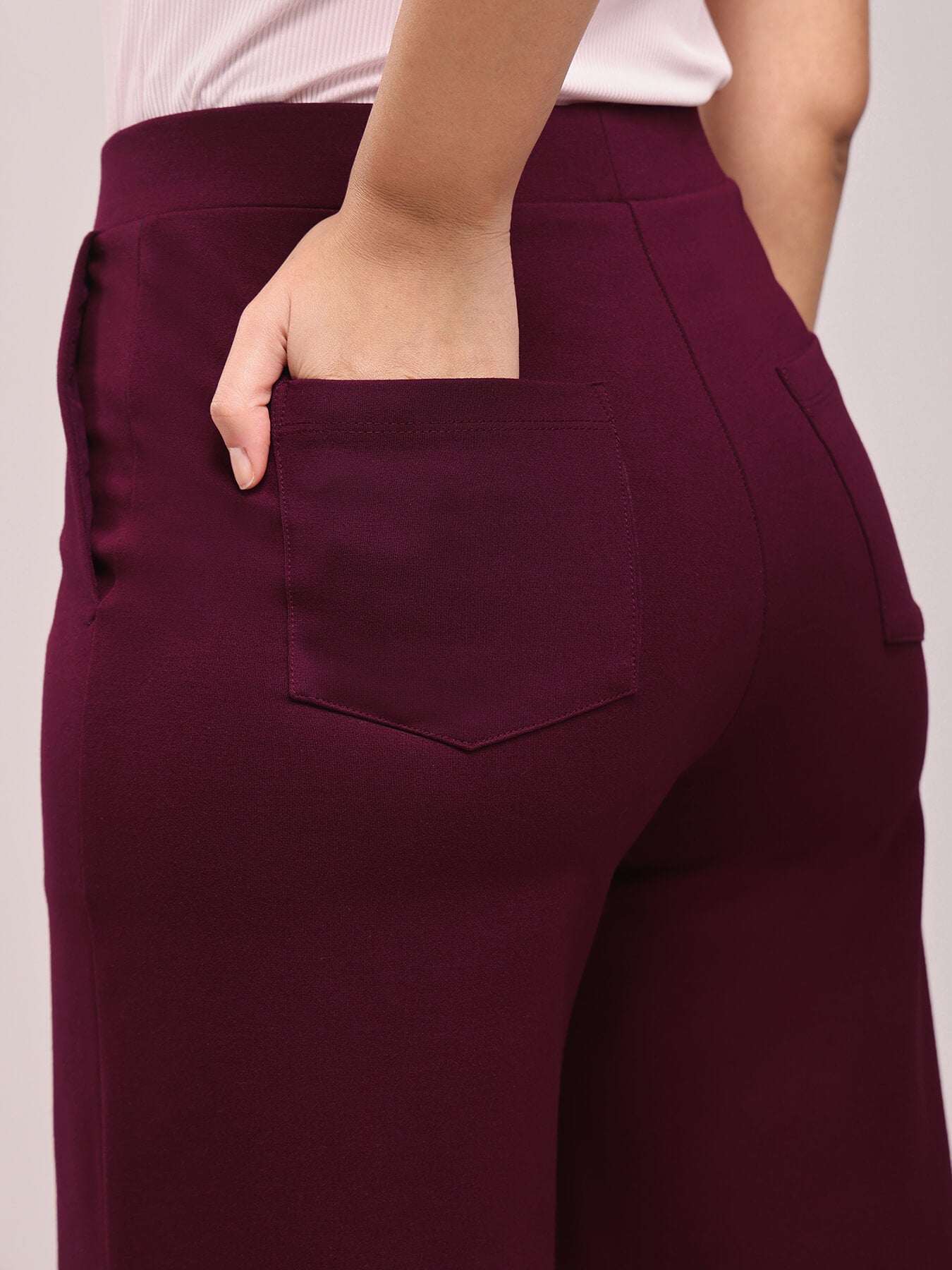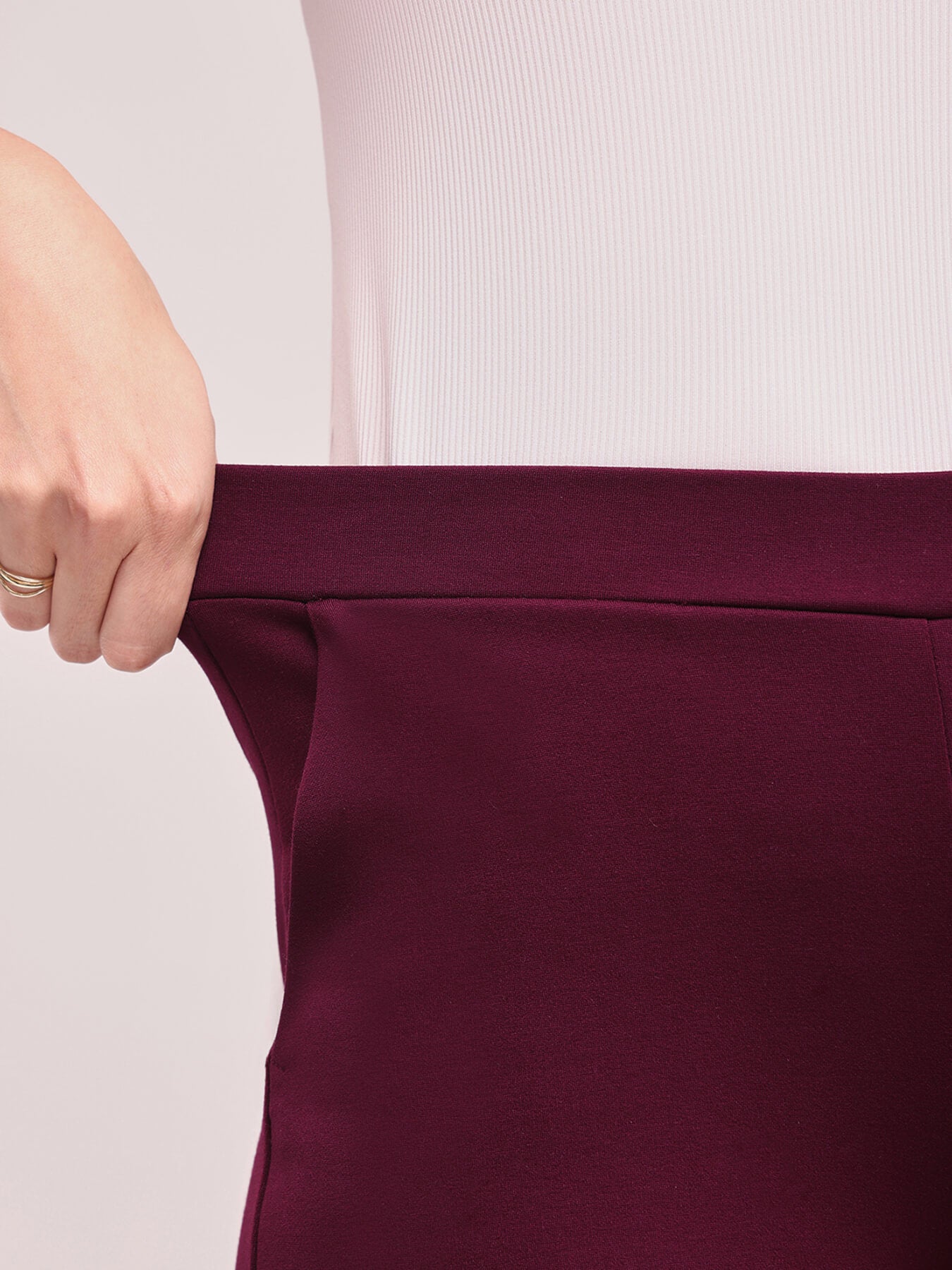 These maroon wide leg, high rise pants are made for the woman on the go. These pants have two front and two back pockets. A Nylon Rayon knit blend pull up pants, these are breathable, super stretchable, super soft, comfortable, anti-wrinkle and anti-pill. The hem of the pants is intended to fall according to the image on a height of 5'3" to 5'5". Colour may vary slightly according to screen settings and resolution.