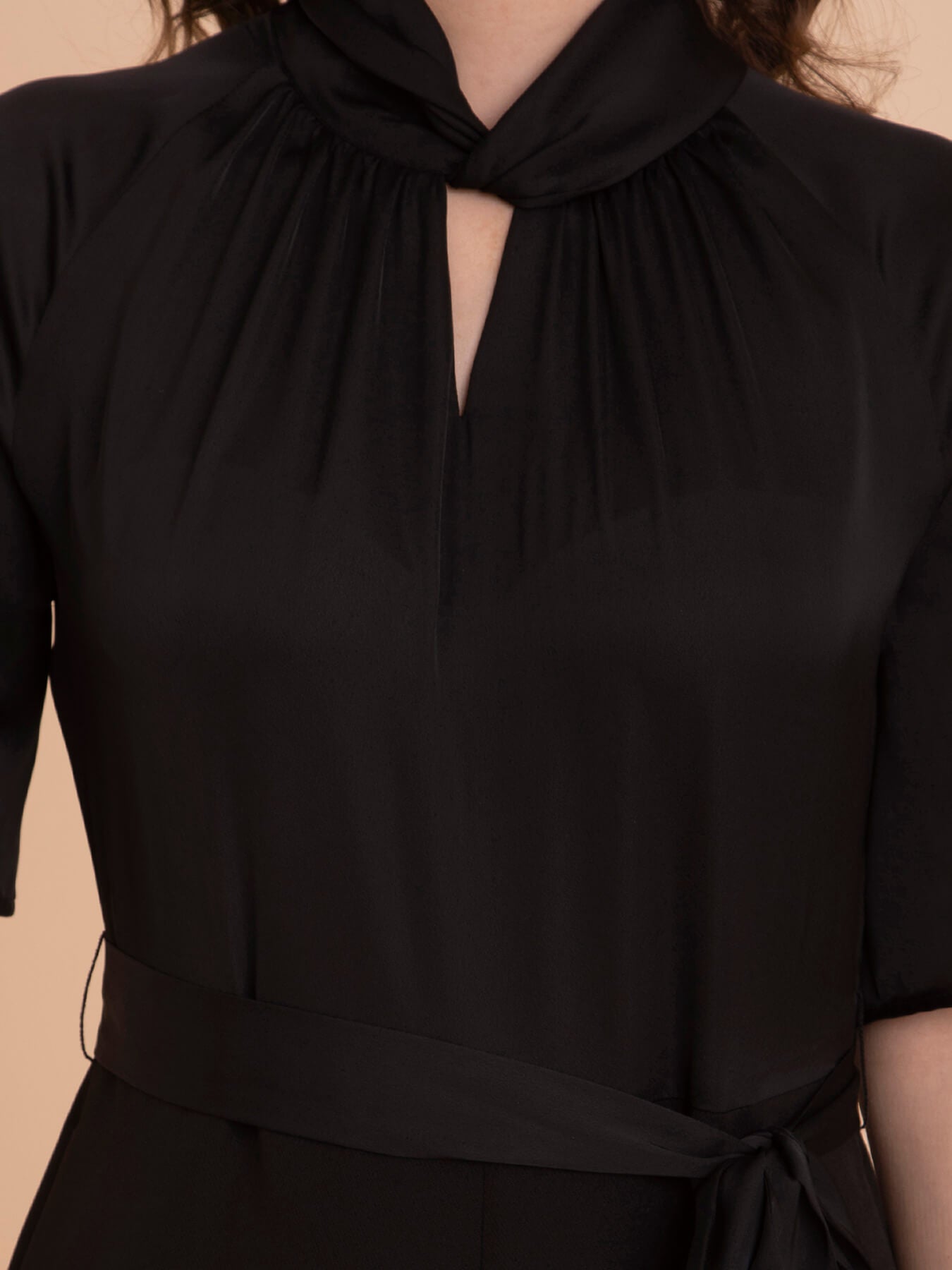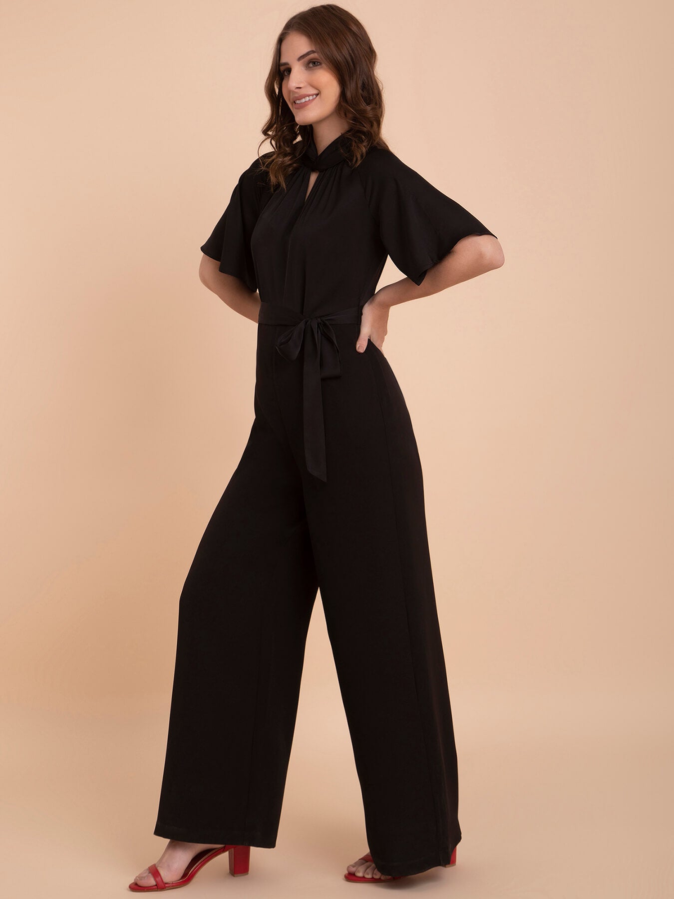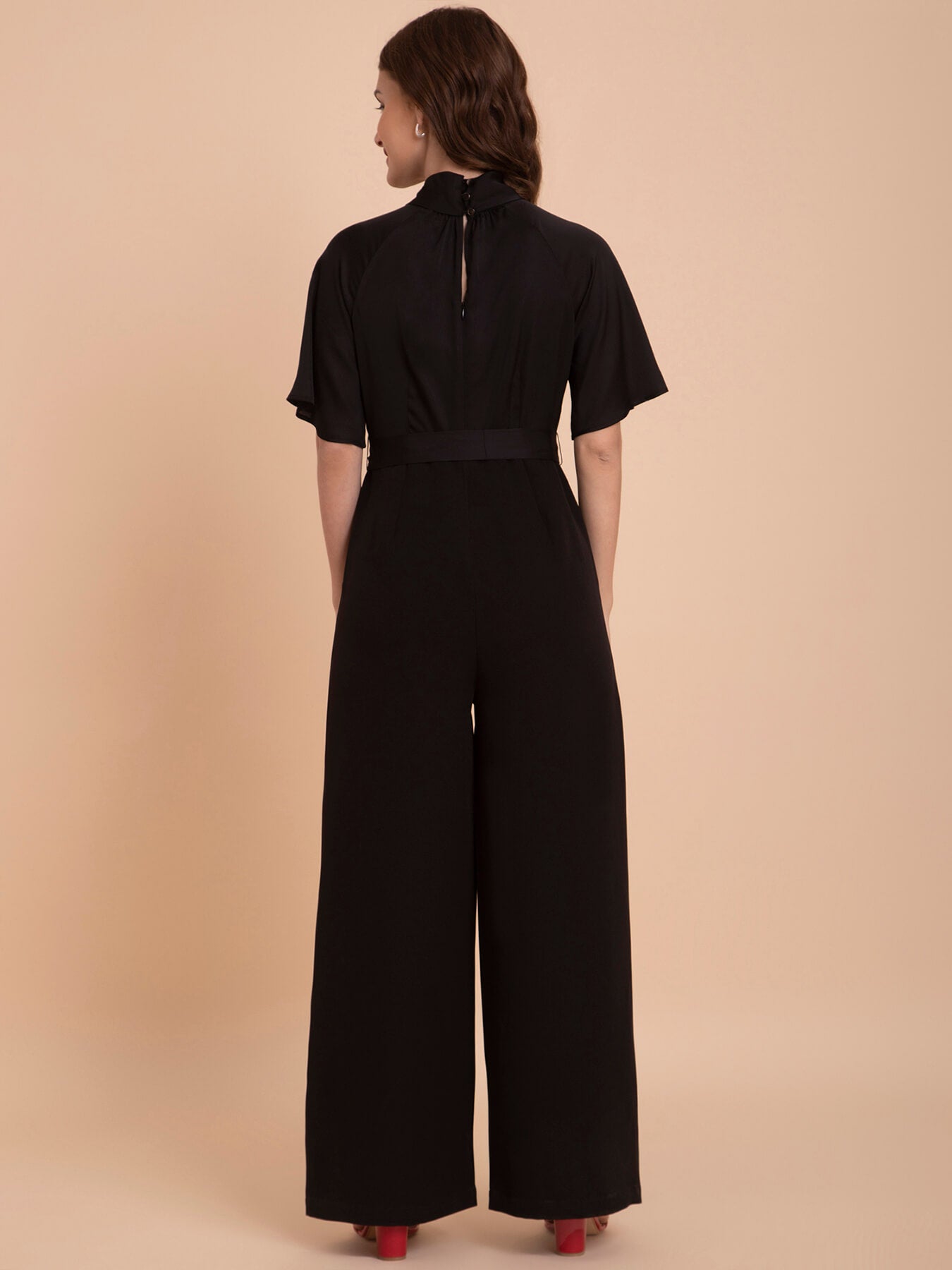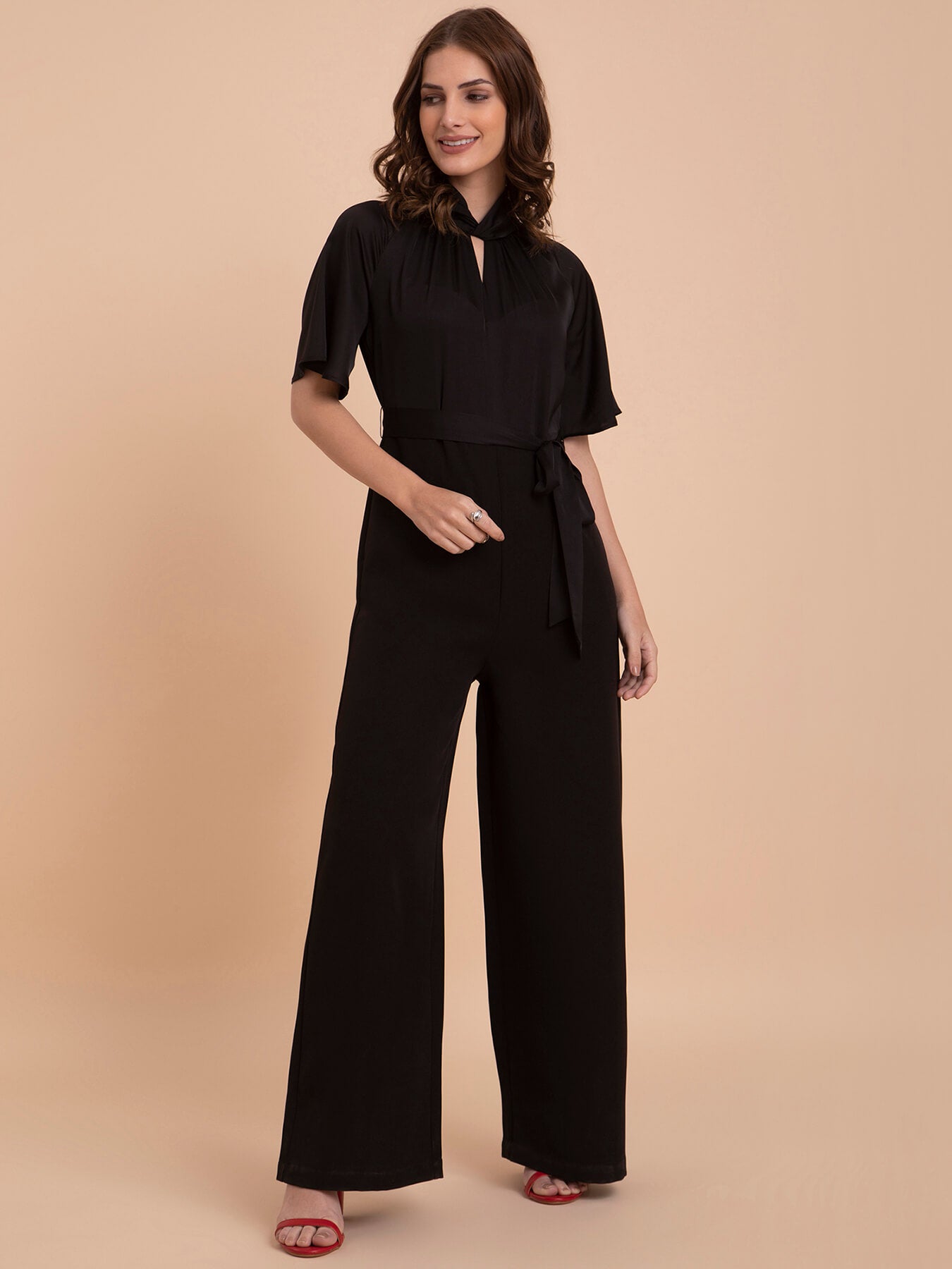 This black solid jumpsuit has a high neck and bell sleeves. Made from Satin and Polyester Lycra, it is soft and comfortable to wear.